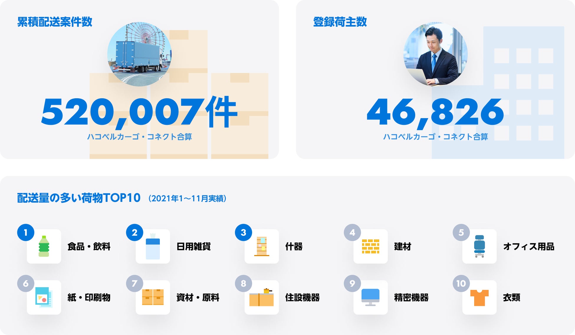 サービス実績では累積配送案件数は52万件超、お取引荷主数は4万件超と引き続きハコベル導入・活用をいただいており、多様な物流ニーズに応えてまいりました。2021年も続いた新型コロナウィルス感染拡大の影響から、巣ごもり需要やリモートワークを背景とした通販需要の拡大を背景に「食品・飲料」「日用雑貨」「衣類」など、個人宅への宅配数が増加しております。