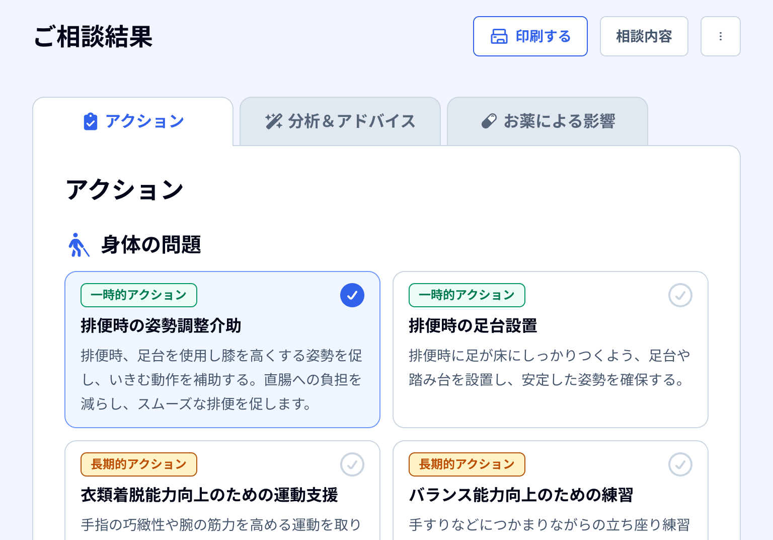 「教えて!排泄ケア」は、体調の変化やどういうケアをすべきかなどの悩みに対し、服薬情報、既往歴、日常生活動作の能力、排泄に関する情報などの断片的な情報から統合的に分析し、課題の背景にある複数の要因を「影響分析&アドバイス」として網羅的に整理した上で、具体的な対策を複数提案します。ベテラン職員のように広い視野で仮説を立て、具体的な対策を検討できるようになることで、施設全体のケアレベルの底上げを実現します。