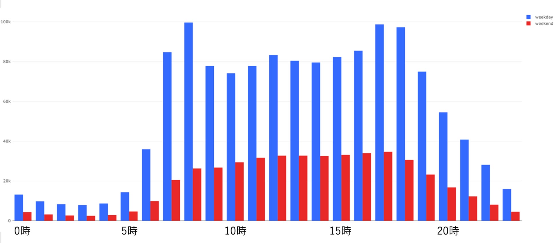 ・午後は17時から18時の退勤時間帯にピークを迎え減少していく