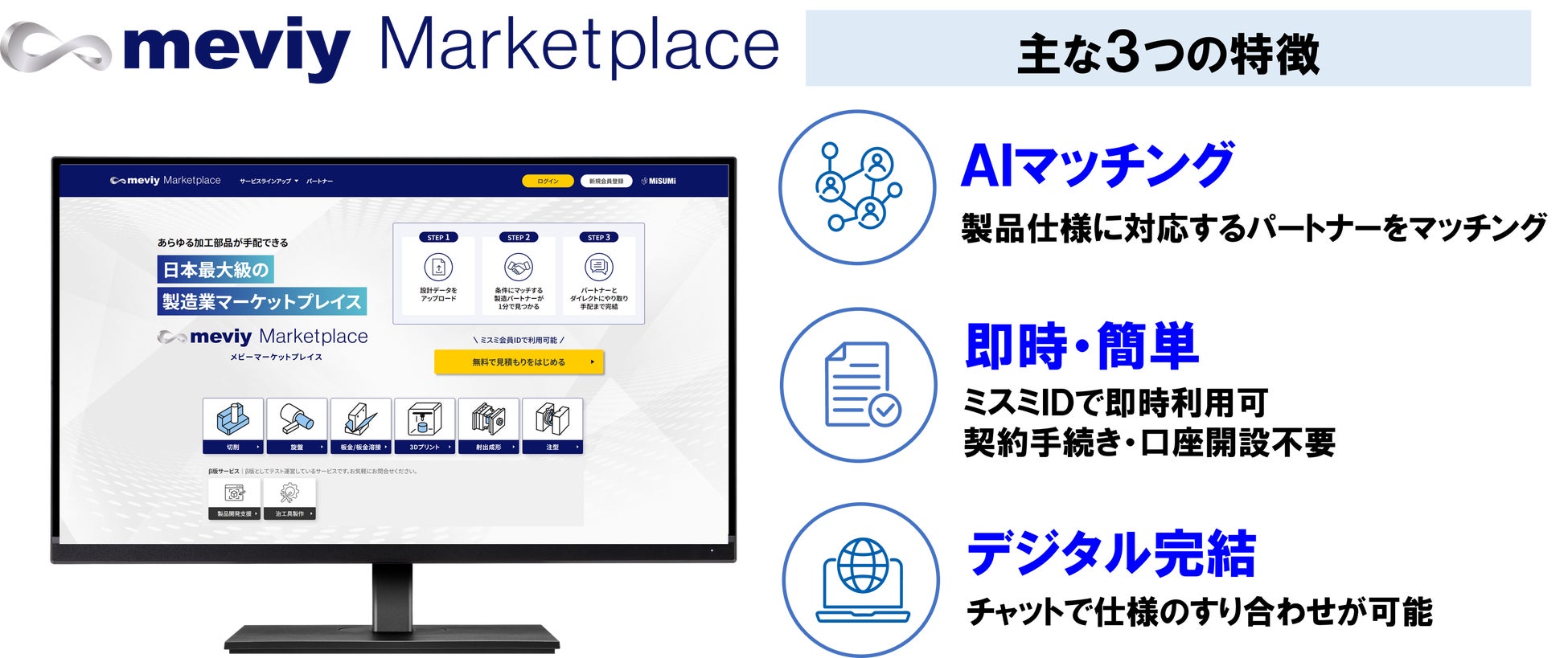 株式会社ミスミグループ本社(本社:東京都千代田区、代表取締役社長:大野龍隆)が提供する機械部品調達のAIプラットフォーム「meviy(メビー)」は、新たに日本最大級の製造業マーケットプレイス「meviy マーケットプレイス (メビーマーケットプレイス)」を発表します。今回のサービス開始により、お客さまはあらゆる機械加工部品をワンストップで手間なく調達できるようになり、さらなる時間価値を提供します。