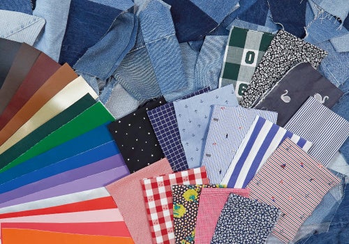 ファミリアは、生産にあたり新たな資材は発注せず、すべて残反から手作業でアイテムを製作することで、本企画の根幹となるアップサイクルを用いました。デニムバッグの本体は、リーバイス® 501®のユーズドストック生地を使用。裏地や合成皮革(以下「合皮」)部分には、ファミリアのデニムバッグやお洋服を作る際に発生する残反を活用しています。さらに本体生地を裁断した残りの端材は、持ち手部分やチャームに活用することで、できるだけ資材を残さないように工夫しました。