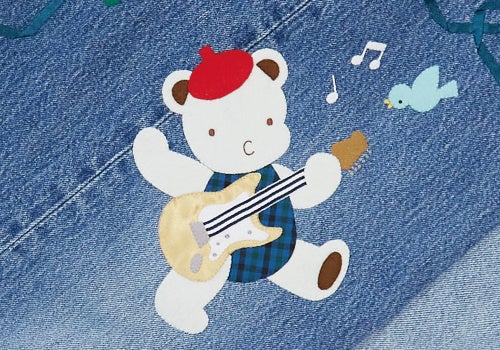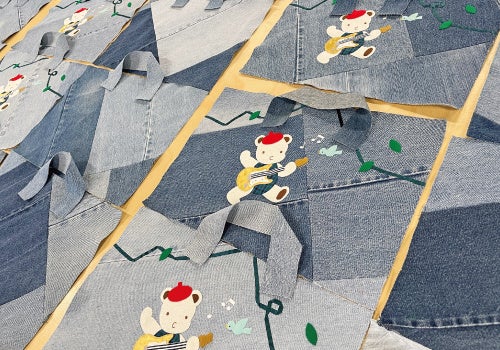 今回のデニムバッグのアートは、子どもたちが豊かに暮らす未来でギターを弾いて楽しく歌う姿を思い描いて作成しました。また、アップリケや刺繍はすべて手刺繍で施されており、手作業ならではのあたたかみが感じられます。そんな作り手のひと針ひと針に、子どもの笑顔あふれる未来を願ったメッセージが込められています。