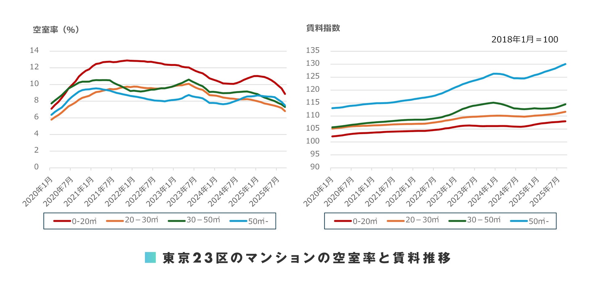 東京23区ではアパート・マンション共にすべての面積帯で空室率が改善しました。募集賃料の上昇は継続していますが、マンションの家族向け(50㎡-)を除き、平均支払い賃料(以下、支払い賃料)の上昇は伸び悩んでいます。住宅情報提供会社が発表している募集賃料の算出データには新築物件が多く含まれているため、募集賃料の上昇幅が大きくなっていますが、既存物件の支払い賃料改定は、難航していることがうかがえます。特に、供給過剰感のある単身者向け(0-20㎡、20-30㎡)の支払い賃料の上昇は緩やかです。