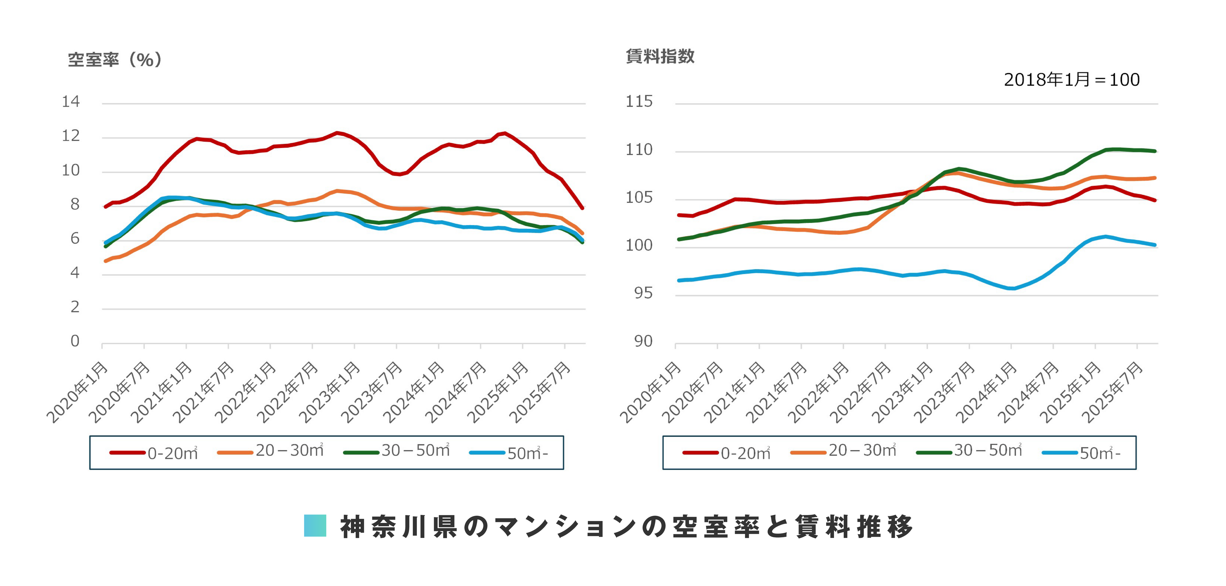横浜市では、アパート・マンションのすべての面積帯で、前月比で空室率が改善しましたが、前年同月比では、アパートの20-30㎡、50㎡-、マンションの20-30㎡、30-50㎡の空室率が悪化しており、市場が一進一退を繰り返していることがうかがえます。支払い賃料については空室率が高い0-20㎡が軟調に推移しています。また、新築・中古マンションと競合しているマンションの50㎡-の支払い賃料が上げ渋っています。