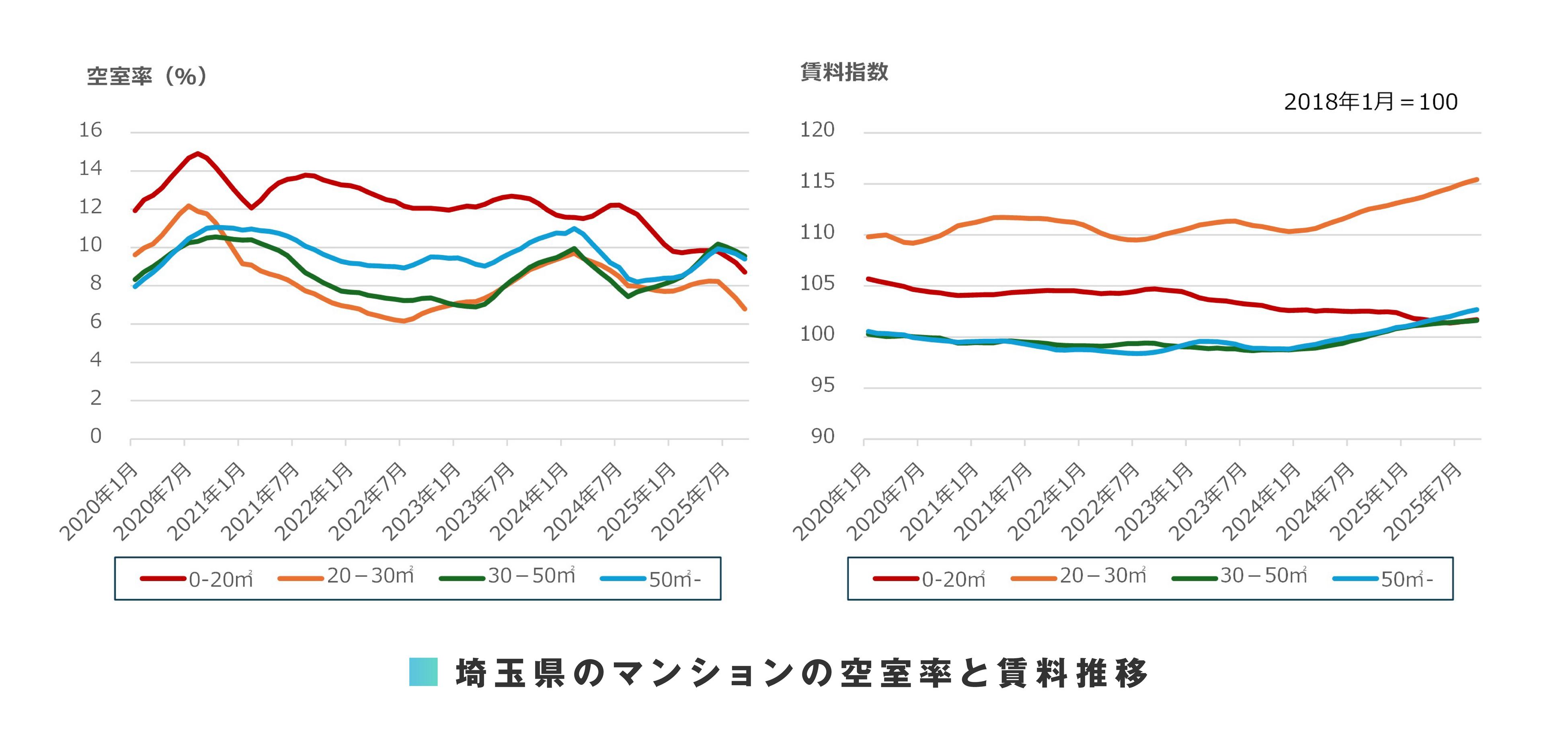 さいたま市では、カップル向け(30-50㎡)、家族向け(50㎡-)の空室率の悪化が継続しています。埼玉県では東京23区に比較して新築・中古マンションの価格が低いことから、ローンの返済金額に比較してこれらの面積帯の賃貸住宅の支払い家賃が割高とみられている可能性があります。空室率は全面積帯で弱含んでおり、市場が供給過剰気味になっていることをうかがわせます。