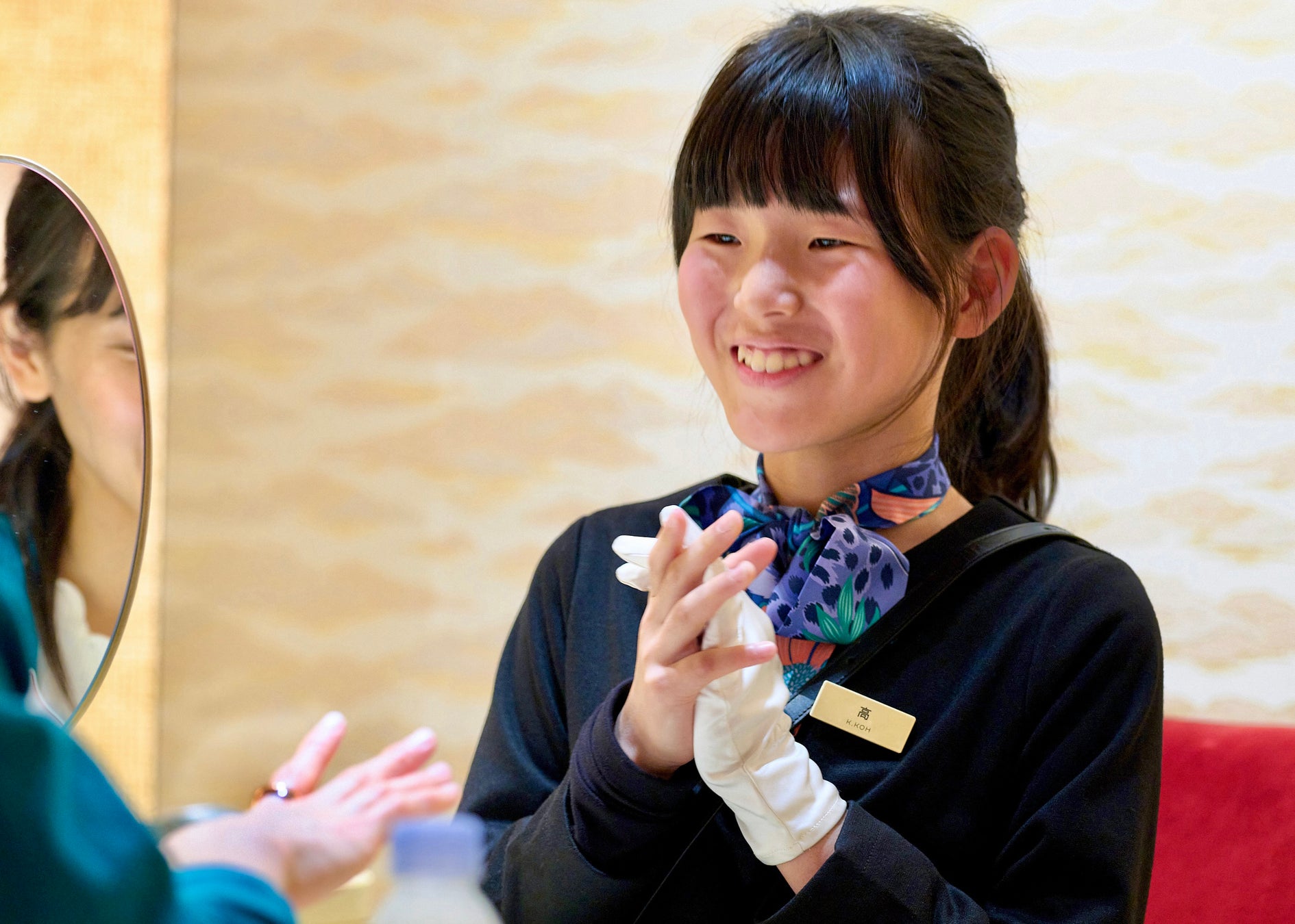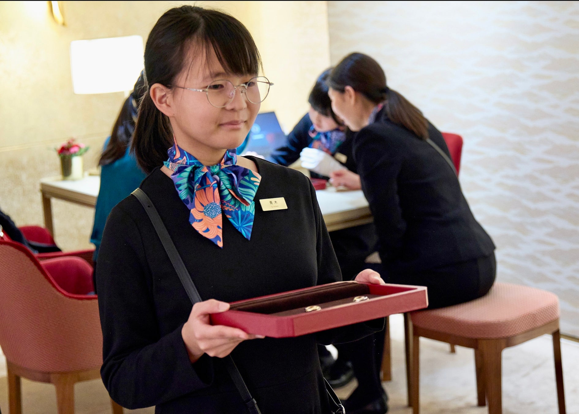 そして、華やかな空間が広がるブティックにて、ブティックスタッフとともに、オープン前の準備から、お客様のお出迎え、そしてカルティエのアイコン「トリニティ」の紹介に挑戦。学びを実践する接客体験を通してこども達は、驚きや気づき、達成感に満ち溢れ、未来につながる1日を過ごしました。
