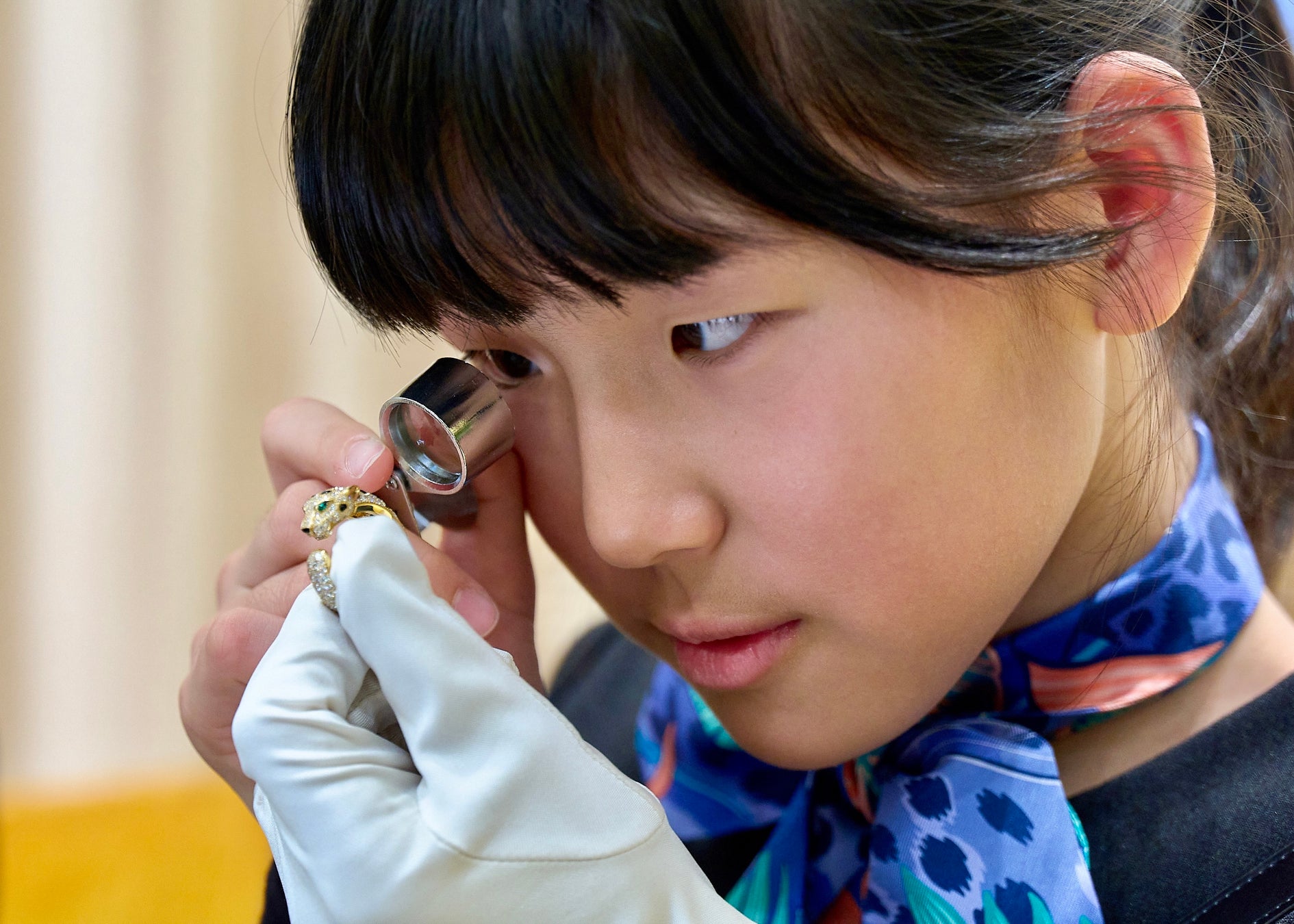 特別なユニフォームに身を包んだこども達は、真剣な面持ちでカルティエの歴史や伝統について学ぶとともに、カルティエのクライアント アドバイザーとしての立ち居振る舞い、所作、ラッピングやメゾンの魅力をお客様にお伝えする接客スキルを熱心に学びました。また、カルティエの象徴「パンテール」があしらわれたブレスレットやリングをルーペで観察。卓越した職人たちの熟練技による美しいジュエリーを通して、1847年創業時より変わることなく普遍の美を追求するカルティエのモノづくりにも触れました。