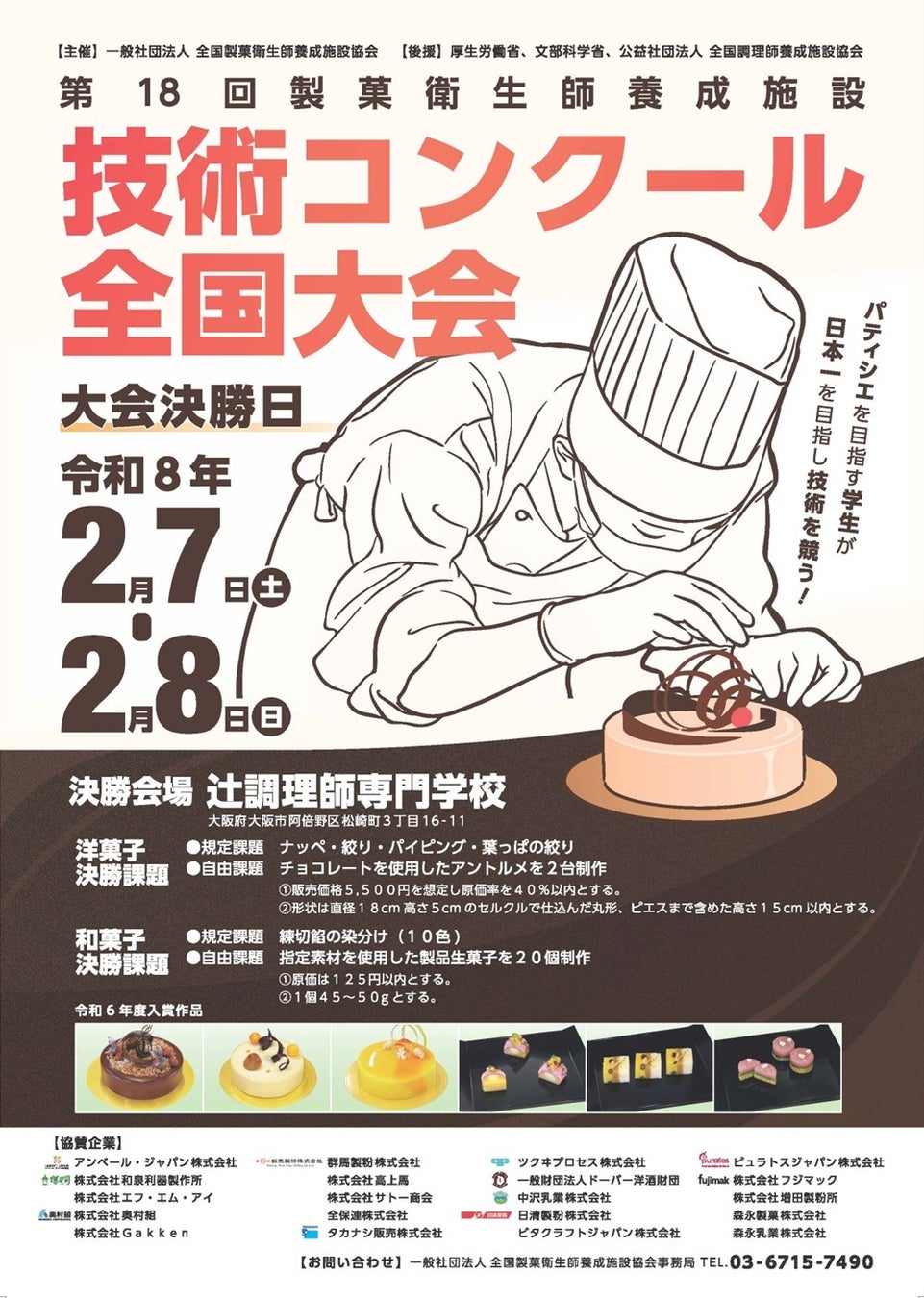 一般社団法人全国製菓衛生師養成施設協会が主催する「第18回製菓衛生師養成施設技術コンクール全国大会」が2026年2月7日(土)・8日(日)の2日間、辻󠄀調理師専門学校(大阪市)にて開催されます。