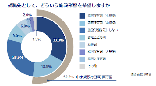今回の調査では、保育士の半数近くが転職によるキャリアアップを検討しており、保育士以外の職種を考えている方も一定数いることが明らかとなりました。また、就職先を決めるうえで重視する点に関しては「給与・賞与」などの給与面を重視する声が最も多く、希望する施設形態は「中小規模の認可保育園」との回答が半数以上見られました。