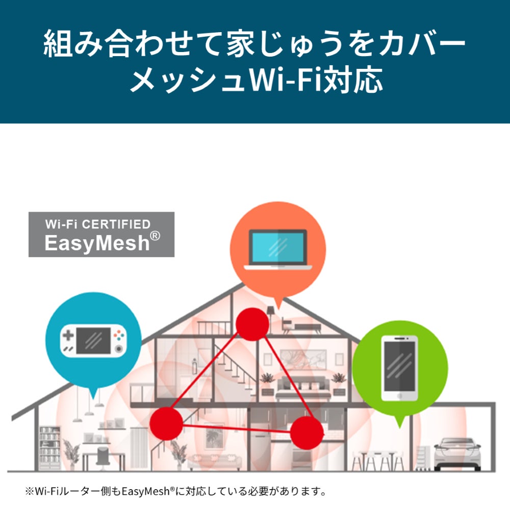 Wi-Fi Alliance®の標準規格「Wi-Fi EasyMesh™」に対応しており、同じく「Wi-Fi EasyMesh™」に対応したWi-Fiルーター・Wi-Fi中継機と本商品を自由に組み合わせることで、家じゅうすみずみまで電波を届け、快適なWi-Fi環境を構築することが可能です(※2)。「Wi-Fi EasyMesh™」は無線接続だけでなく、有線接続でもメッシュネットワークを実現できるので、鉄筋コンクリート造や鉄骨造の建物でも、メッシュネットワークを利用できます。