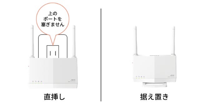 外付けアンテナタイプの「WEX-3000AX4EA」は前後左右にアンテナを倒すことができる可動式アンテナを備えています。設置環境に応じてアンテナを調節することで、効率良く電波を届けることができます。詳しくはアンテナ設定ガイドをご参照ください。またコンセントに直挿しと付属のスタンドを使用した据え置き、設置環境に合わせてお好みの設置方法をお選びいただくことができます。
