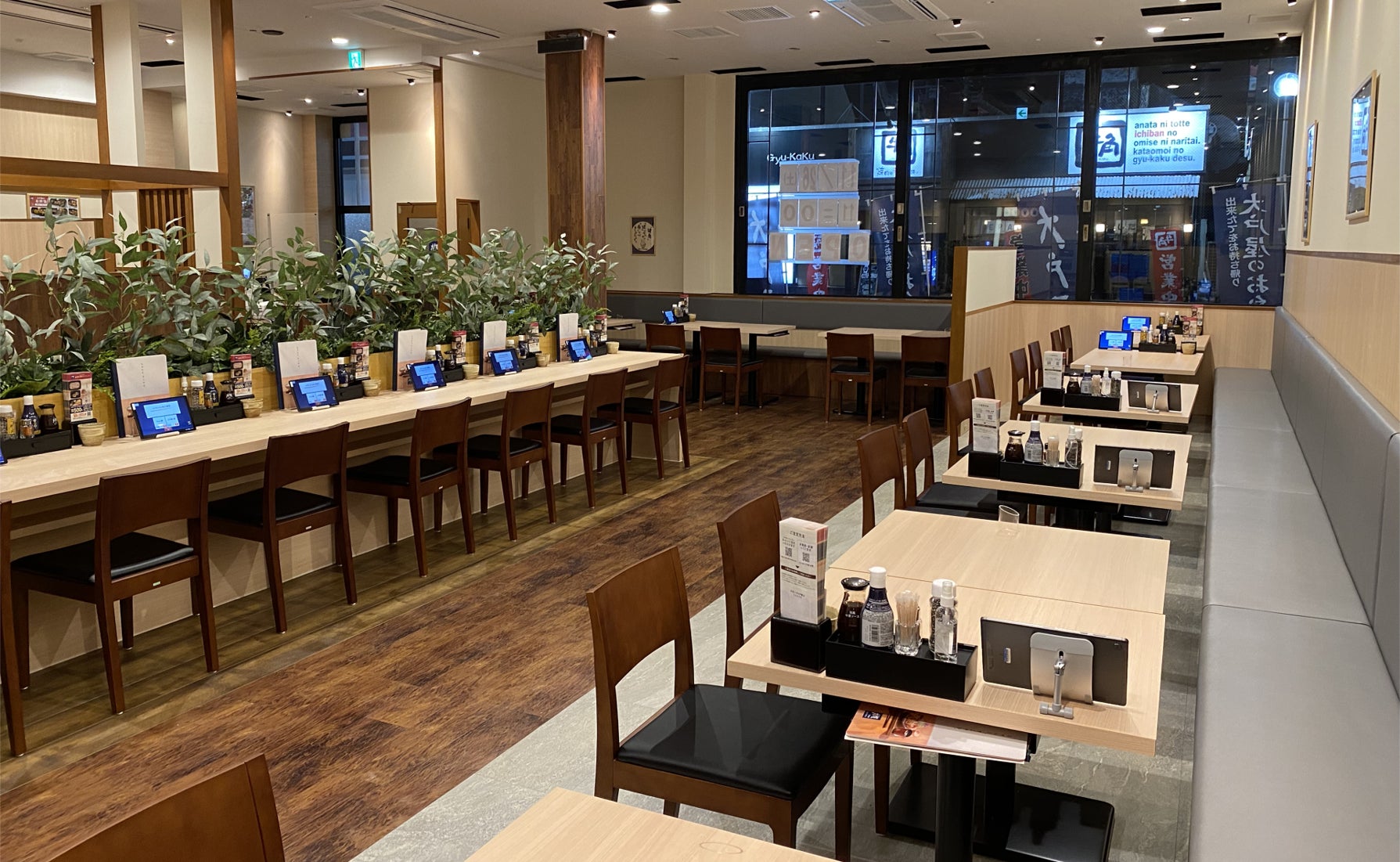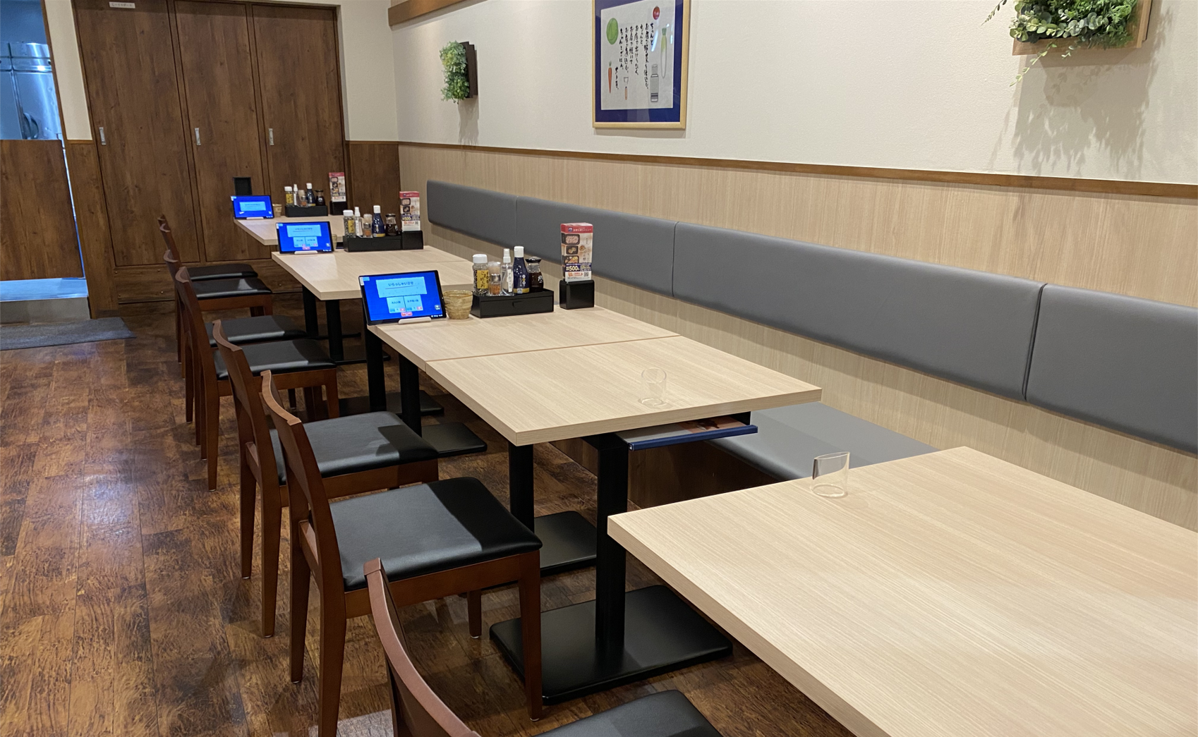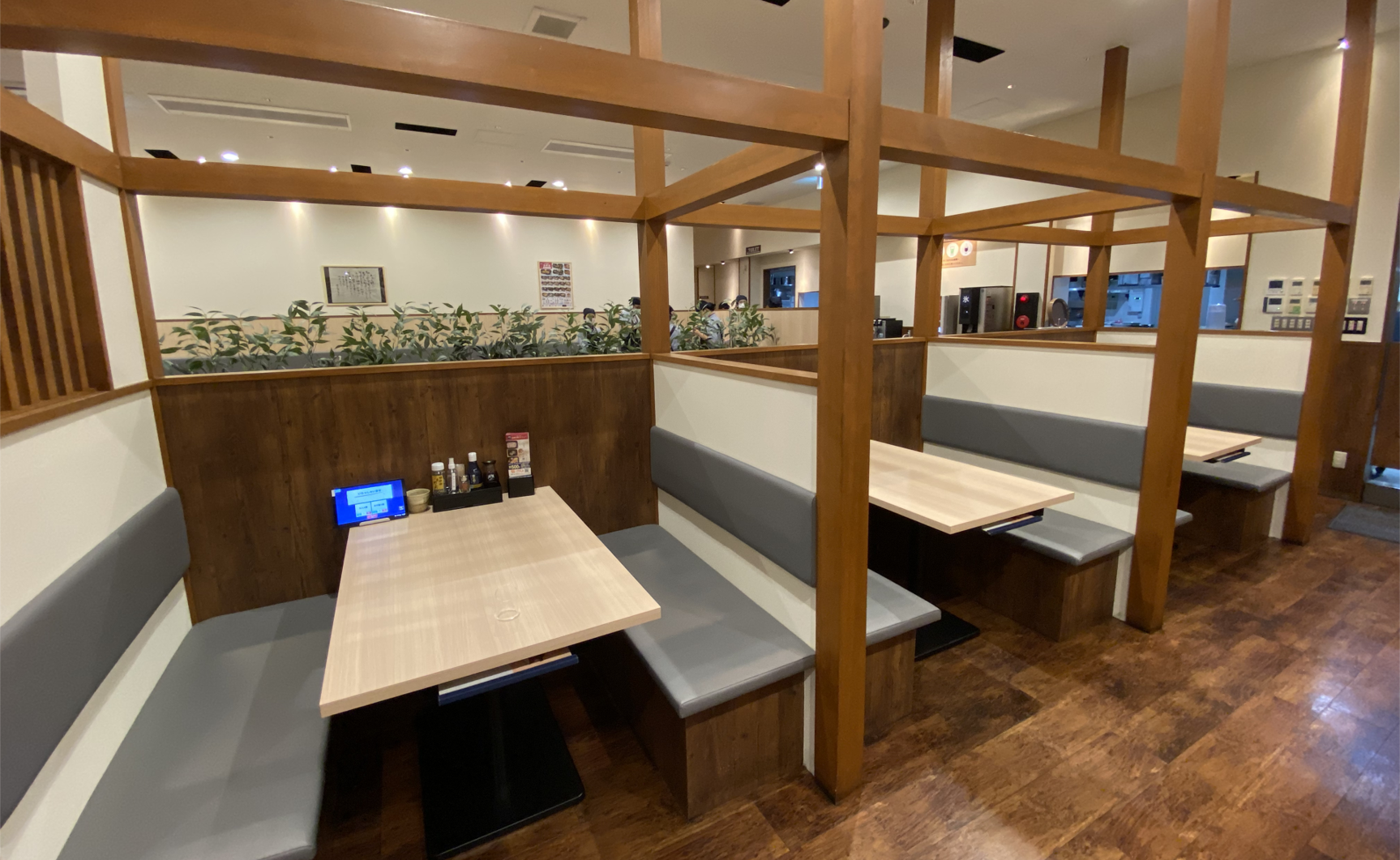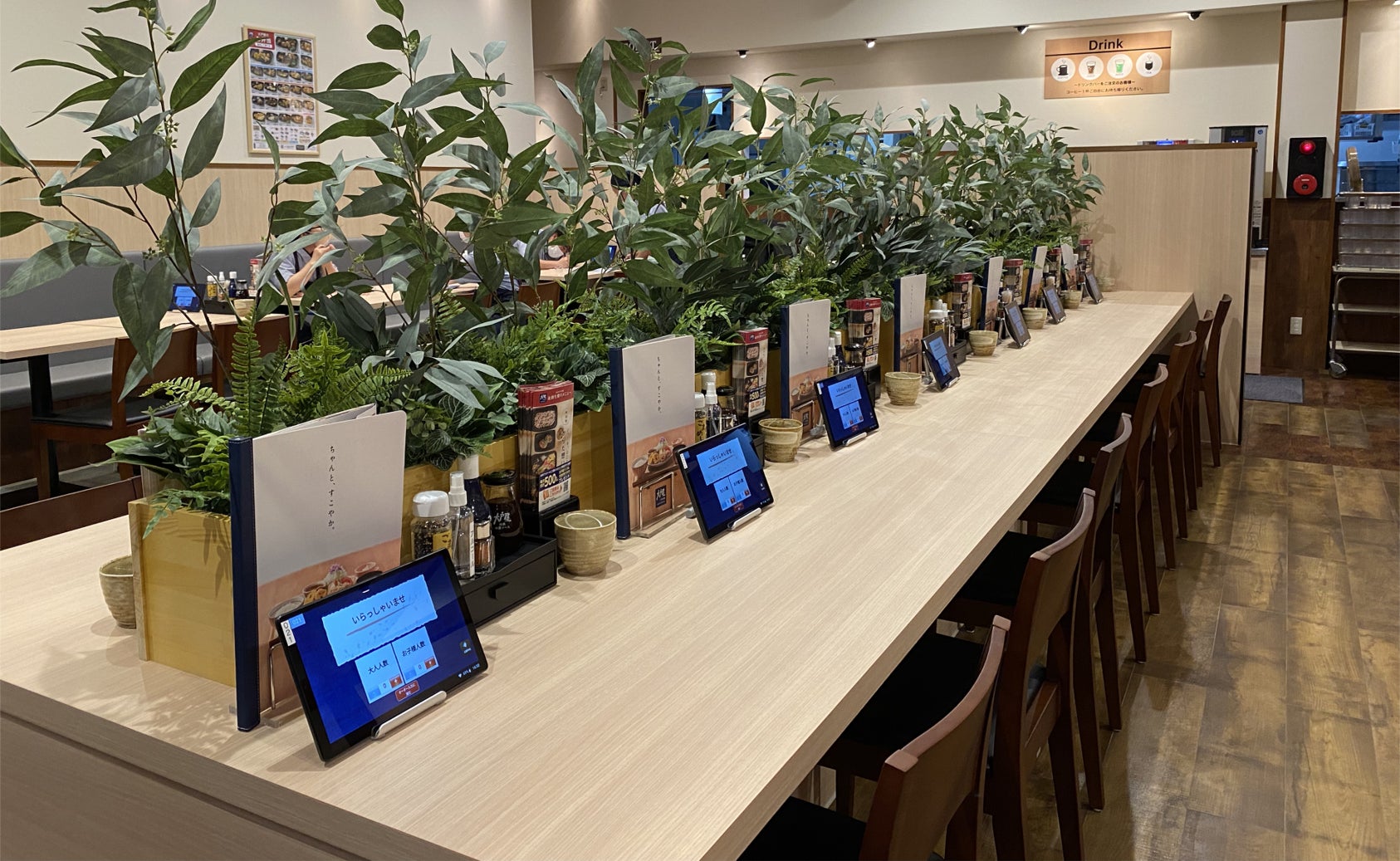 全80席の広々とした店内は明るく開放感があり、ご家族や大人数でのお食事にぴったりです。木のぬくもりが感じられる落ち着いた雰囲気でゆっくりくとくつろぎながらお食事ができます。また、全席タブレット端末によるセルフオーダーシステムを導入しておりお客様と従業員の安心・安全の為、対面サービスをできる限り少なくしております。
