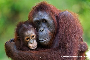 インドネシアのスマトラ島と、インドネシアとマレーシアにまたがるボルネオ(カリマンタン)島の、豊かな熱帯林だけに生息している大型類人猿です。マレー語で「オランウータン」とは「森の住人」という名を持ちます。オランウータンは現在、生息地である熱帯林の急速な消失によって絶滅の危機に瀕しており、その生息域は過去100年の間におよそ80%減少したと見られています。その主な原因は、農地の拡大などによる生息地の減少。また、ペットにすることを目的とした密猟や密輸、地球温暖化による生息環境の変化なども大きな脅威となっています。