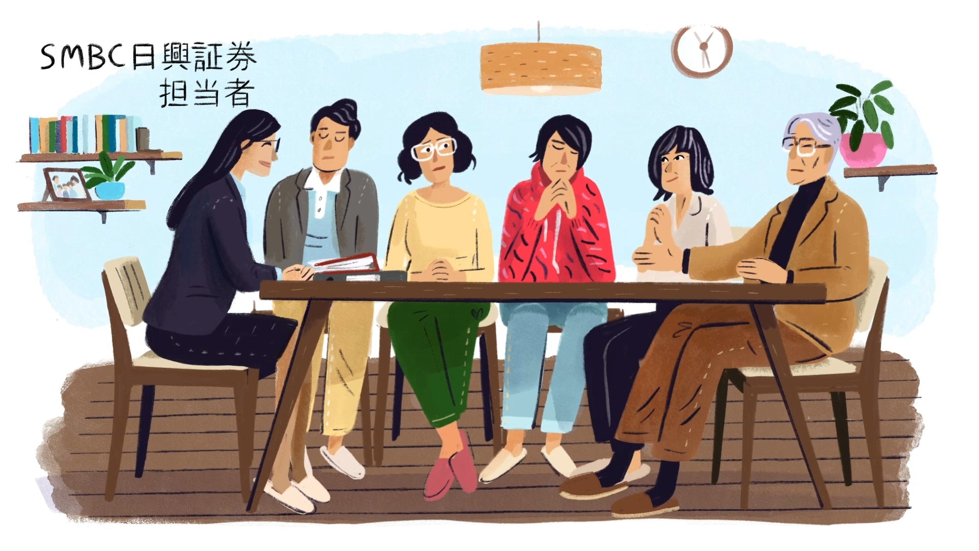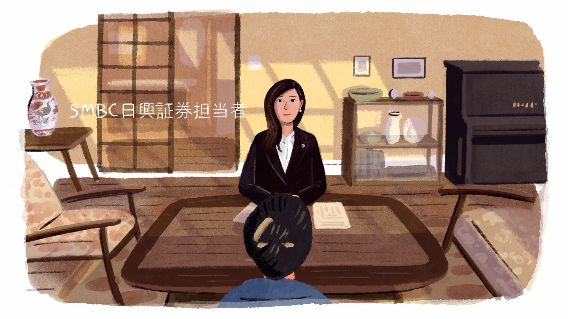 やわらかい光の差し込む書庫で、本を手に取るイチローさん。そこに描かれているのは、さまざまな人たちの資産にまつわるストーリー。「資産には、物語がある。」というイチローさんの語りとともに、本の中の、それぞれの資産の物語が、イラストとともに繰り広げられていきます。
