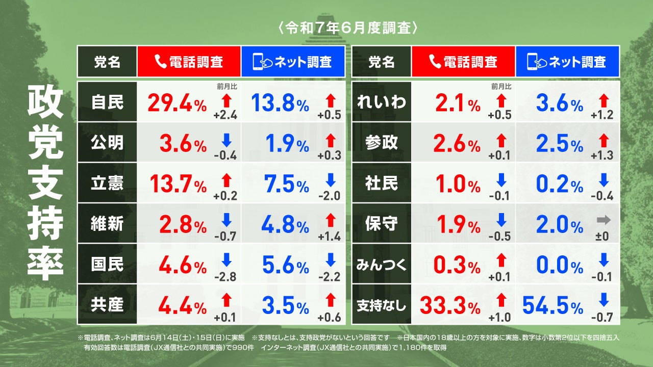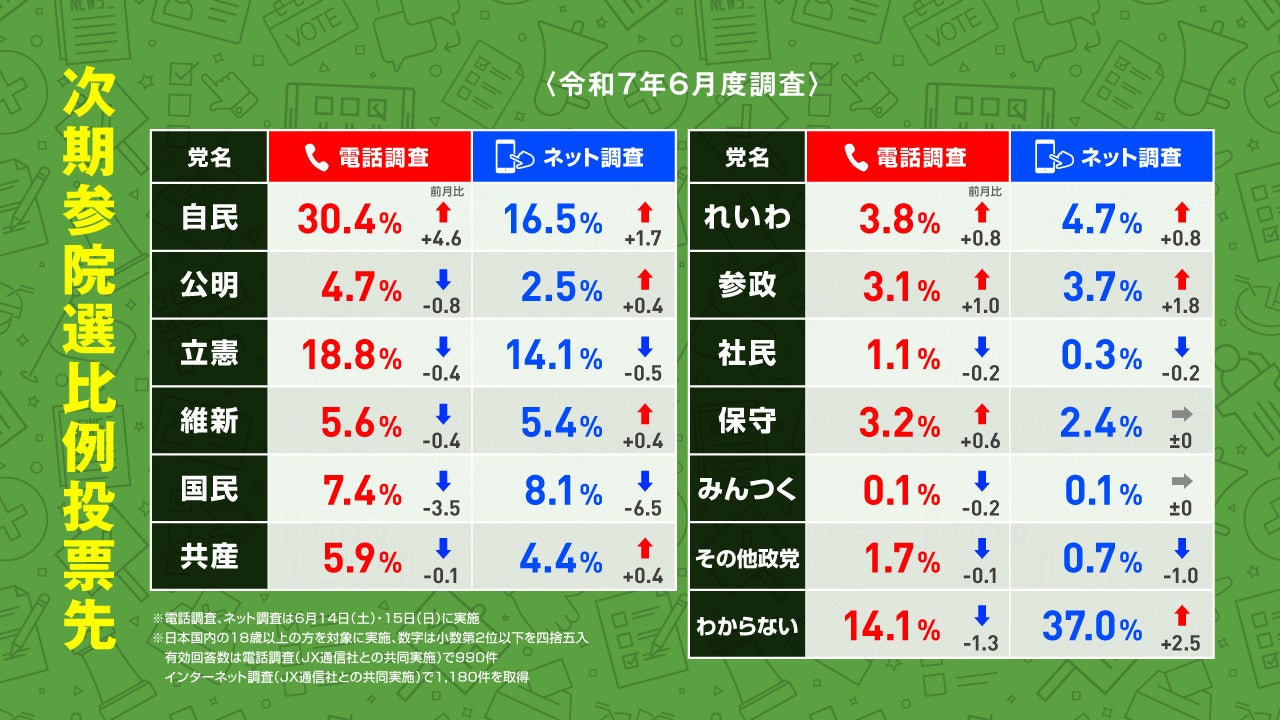 内閣・自由民主党の支持率が回復!国民民主党は支持率・比例投票先とも下落! 2025年6月実施 電話&ネットのハイブリッド意識調査結果を発表【選挙ドットコム×JX通信社】