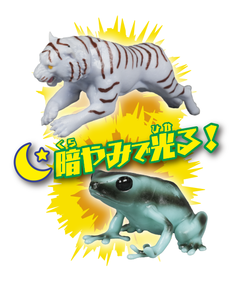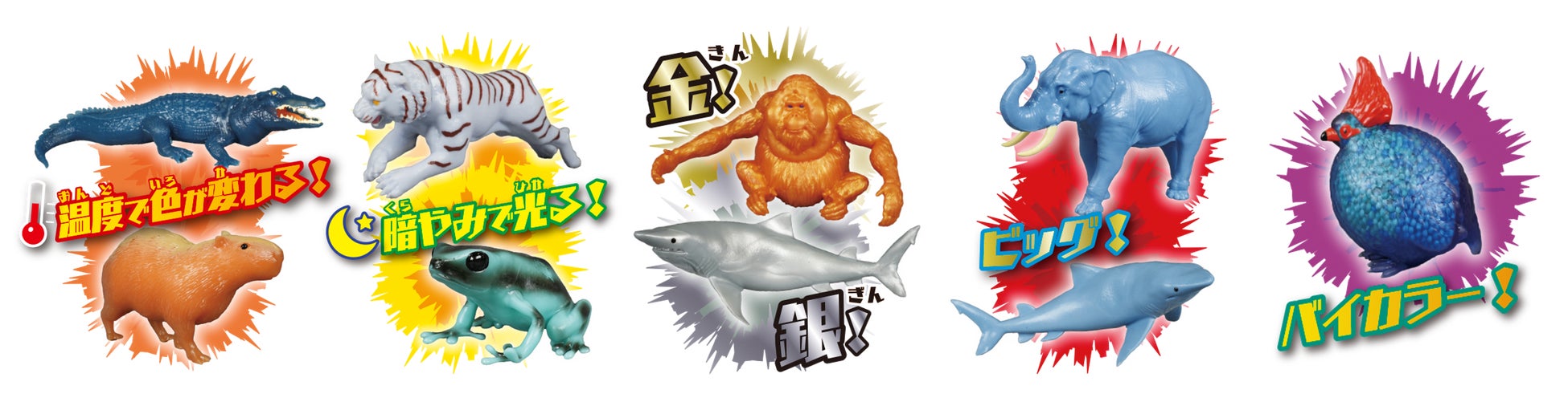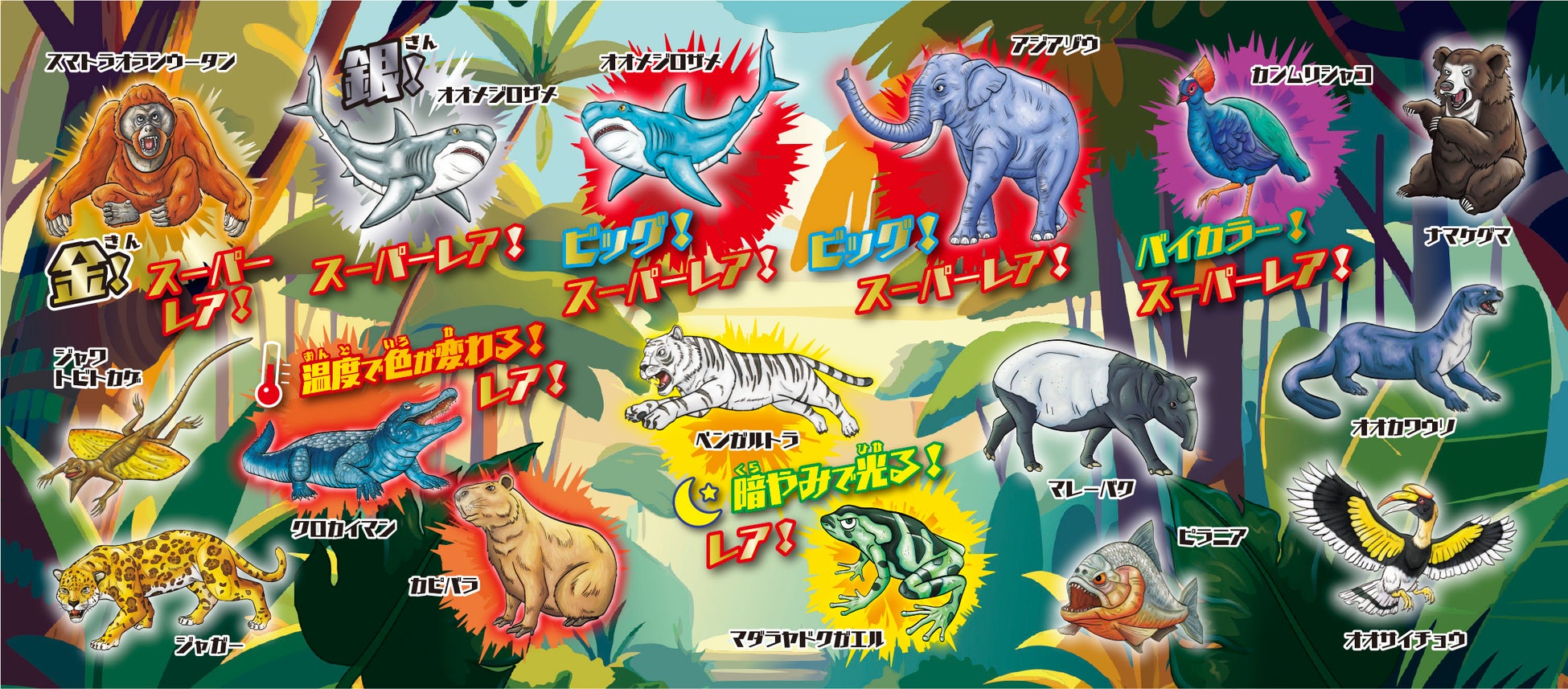 新作が発売されるごとに人気を増すパックトイ「&Co.(アンドコ)」シリーズ。実在する生き物の生態を、ブックレットとフィギュアで楽しく学ぶことができます。第13弾となる今回は“ジャングルに生息する動物”がテーマ。ベンガルトラやアジアゾウなどの陸上動物から鳥類、水辺に棲む動物まで、全16種類をラインナップしています。おなじみの“のび~る”ギミックはもちろん、楽しく遊べる仕掛けが満載。暗やみで光るタイプ(2種)や温度で色が変わるタイプ(2種)をはじめ、ゴールド・シルバーボディ(各1種)やバイカラー(1種)、ビッグサイズ(2種)のレアも登場します。