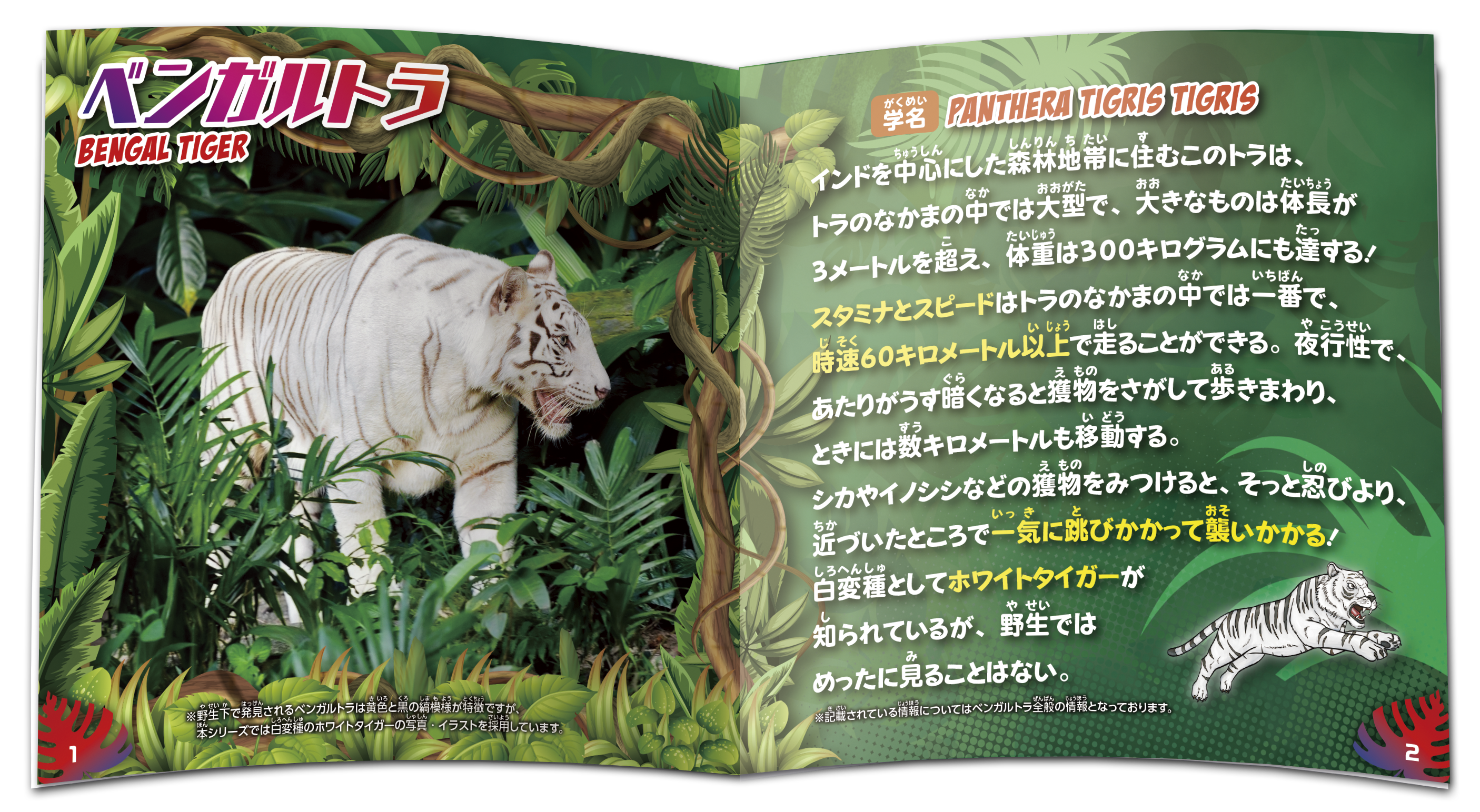 ●ブックレットでは、同梱されたフィギュアの動物の生態が詳しく解説されています。「バトルメーター」で各動物の強さ、「レッドリスト」では絶滅危惧種に指定されているかどうかを知ることができます。