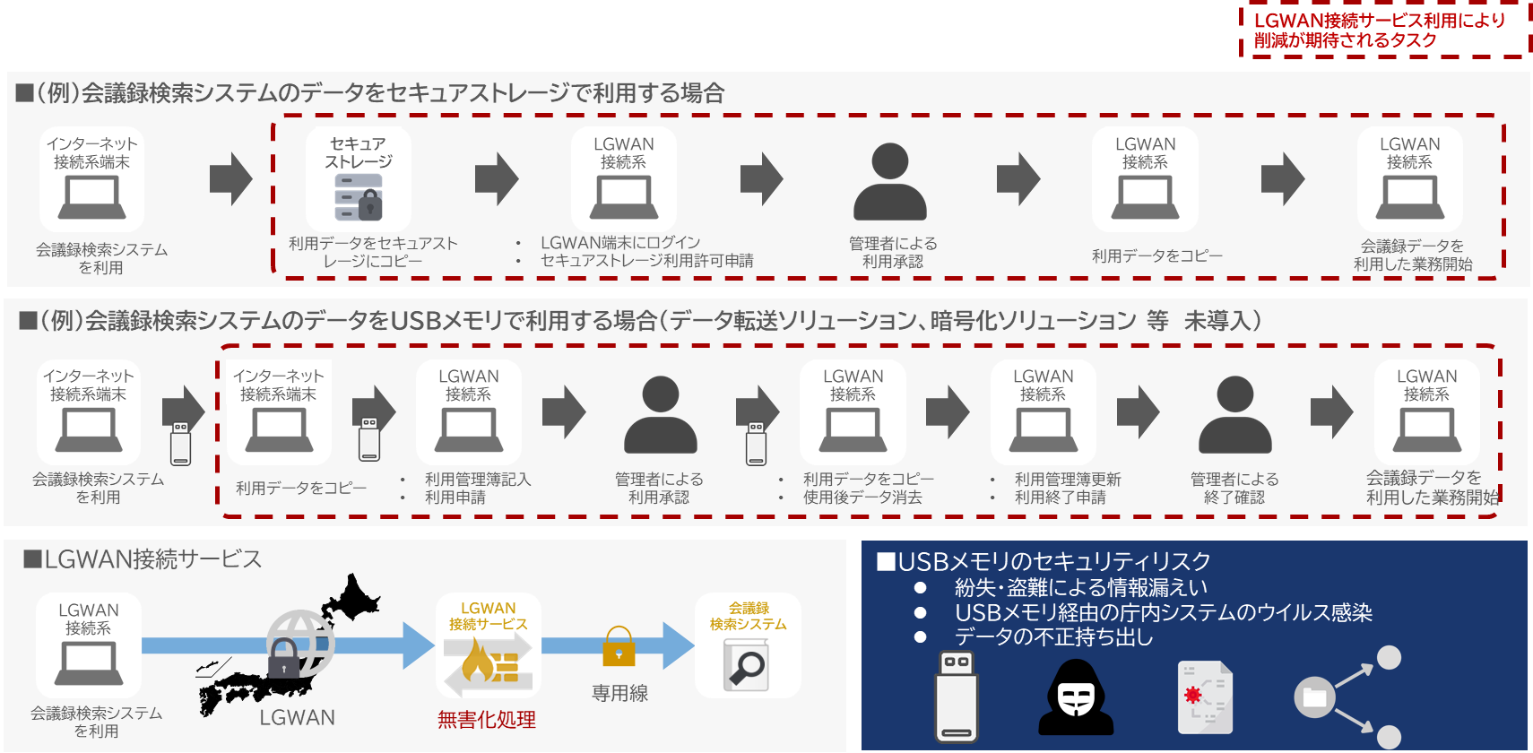 本サービスの利用により、会議録検索システムを利用する業務の負荷が軽減されるとともに、USBメモリを利用しないことによりセキュリティリスクの軽減も期待されます。