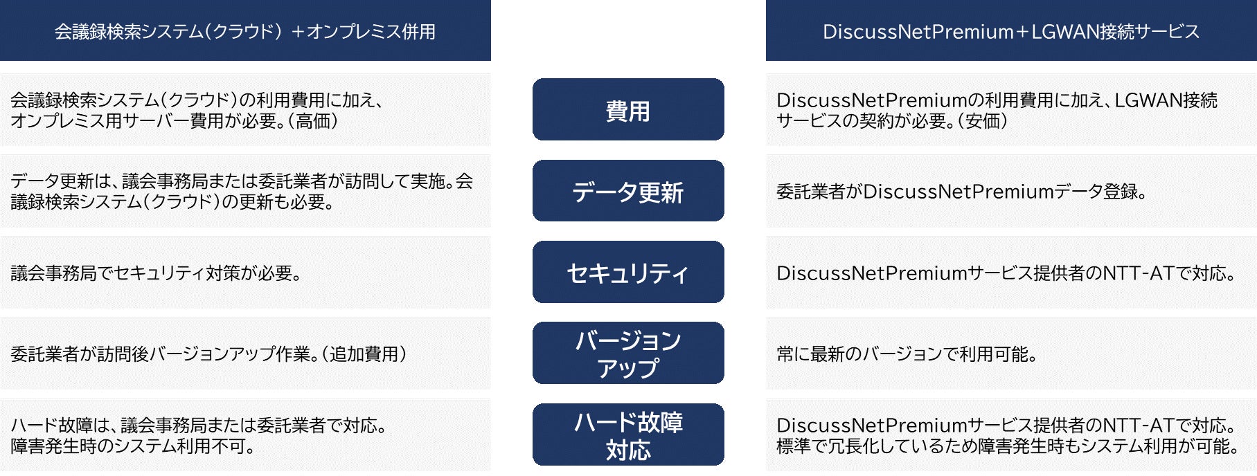 LGWAN上で会議録検索システムを利用するため、オンプレミス版の会議録検索システムを併用する事例もあります。 本サービスの導入により、オンプレミス版併用に比べ、安価に管理作業なしで会議録検索システムの利用が可能となります。