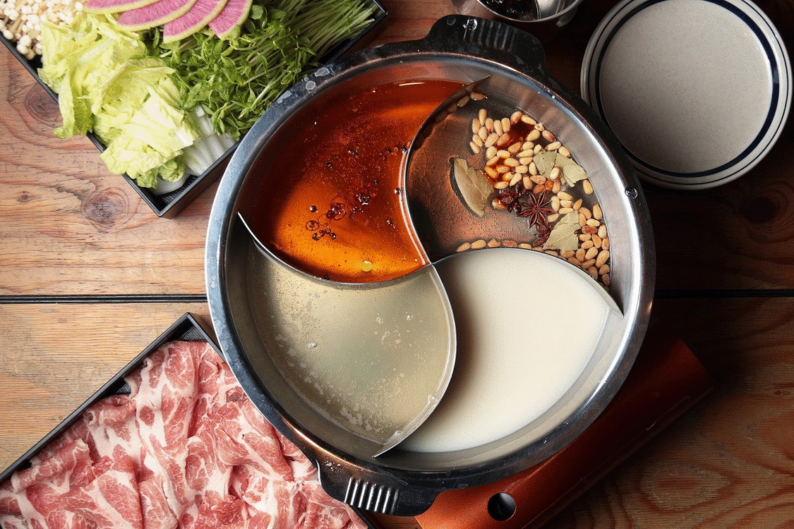 ※お出汁はカツオをベースにした3種類よりチョイス。豆乳出汁、薬膳出汁、シビレピリ辛出汁の3種からお選びいただき、ツケダレはお好みでごまだれ&ポン酢でお召し上がりいただきます。