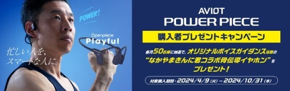 また、対象商品を期間中に購入すると、「AVIOT Openpiece Playful (WB-P1)」をベースとし、スペシャルパッケージに加え、完全新録のボイスガイダンスを搭載した特別仕様の”なかやまきんに君コラボ骨伝導イヤホン(WB-P1-NKN)”が毎月50名様に抽選で当たるキャンペーンも開始いたします。
