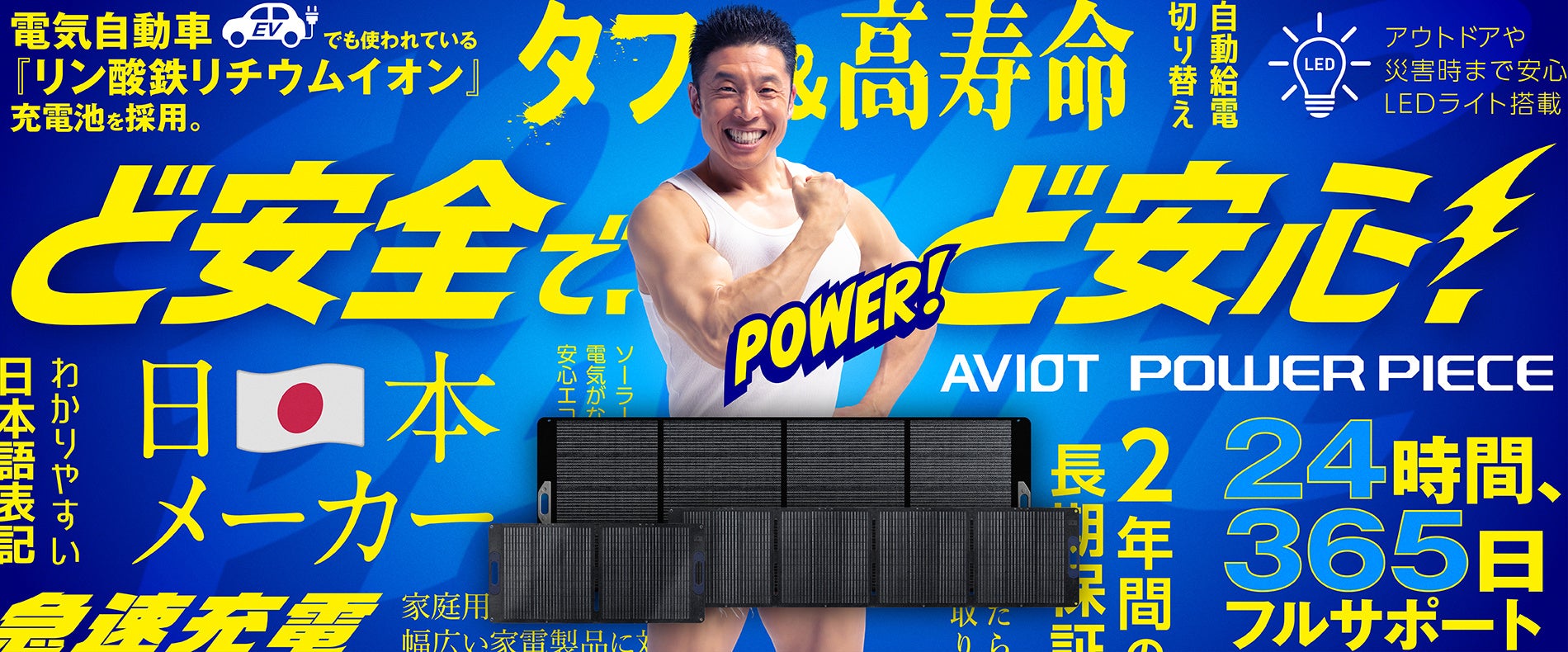 “AVIOT POWER PIECE”シリーズは、全ラインナップに安全性の高いリン酸鉄リチウムイオン充電池を使用し、日本メーカーとしての高い品質基準と、24時間365日国内電話サポートなどの充実のアフターサポート体制で、安心・安全にお使いいただけます。