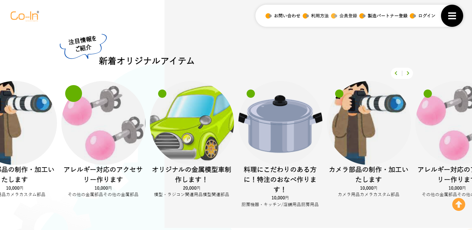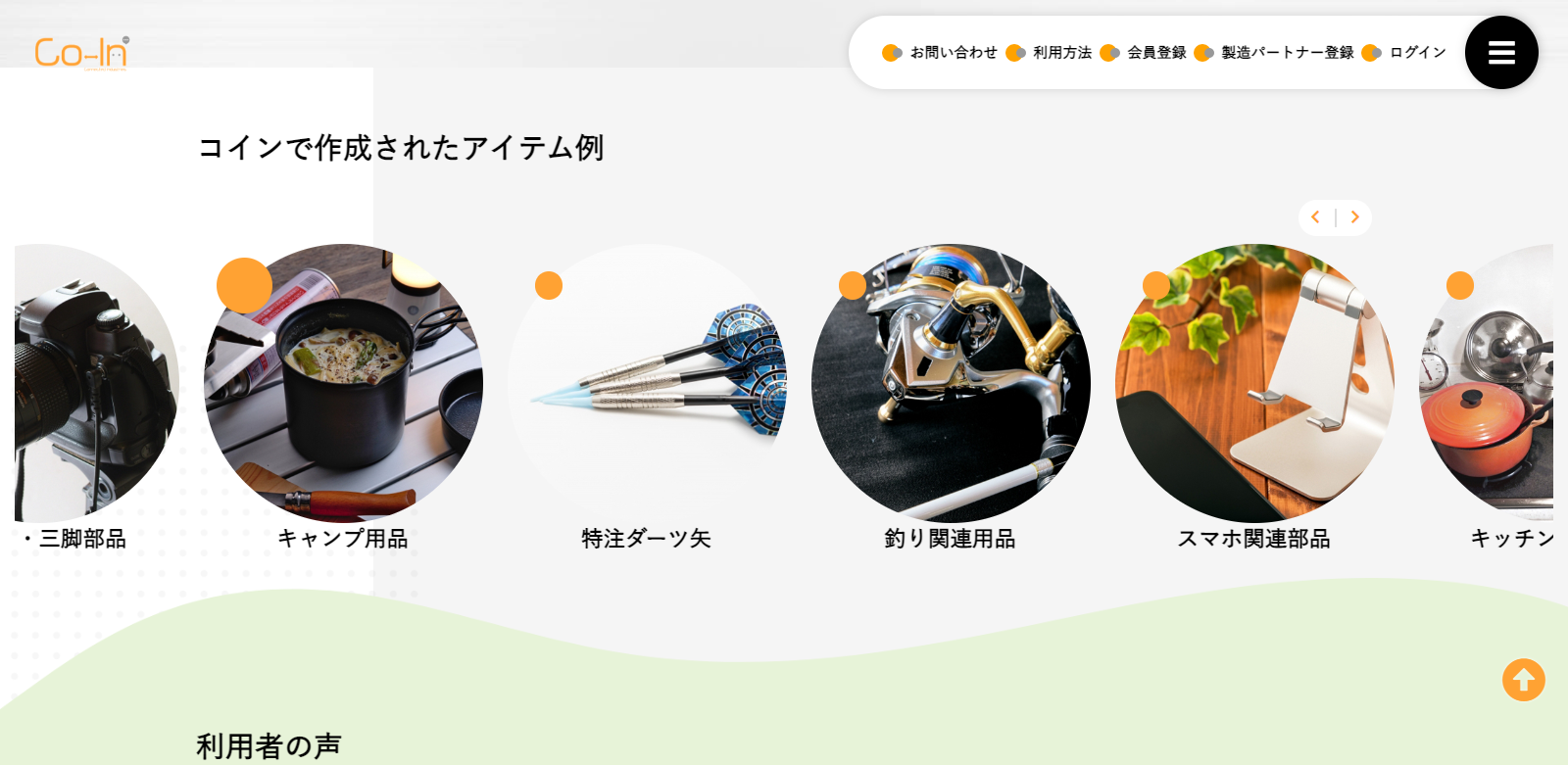 「Co-In」では、車やバイクのカスタムパーツから、ダーツの矢のそれぞれのパーツ(バレル・シャフト・チップ)やカメラと三脚を固定する小さなネジまで、趣味や仕事で使う製品のカスタム部品をオーダーすることができます。