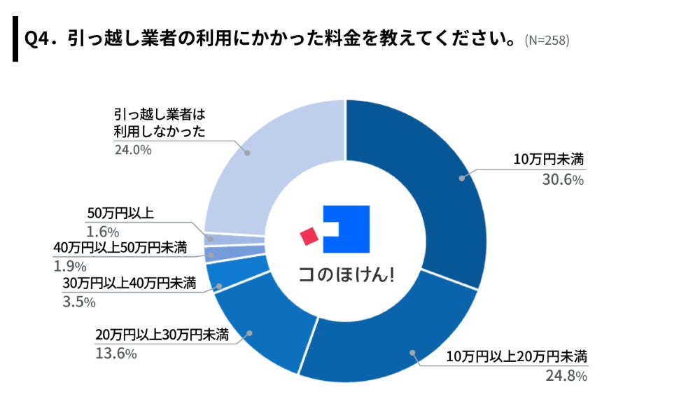 「10万円未満」が最多の30.6%、次いで「10万円以上20万円未満」が24.8%、「20万円以上30万円未満」が13.6%という結果になりました。また「引っ越し業者は利用しなかった」は24.0%となりました。