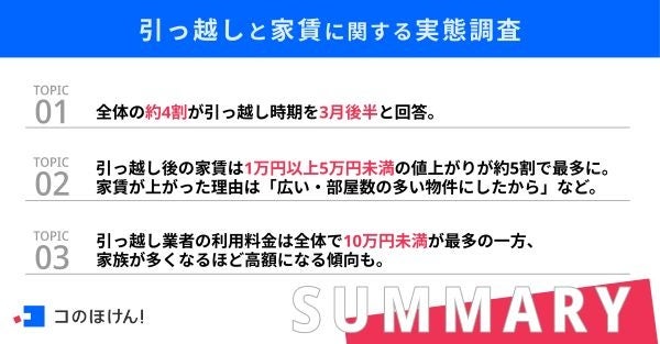・引っ越し後の家賃は1万円以上5万円未満の値上がりが約5割で最多に。家賃が上がった理由は「広い・部屋数の多い物件にしたから」など。