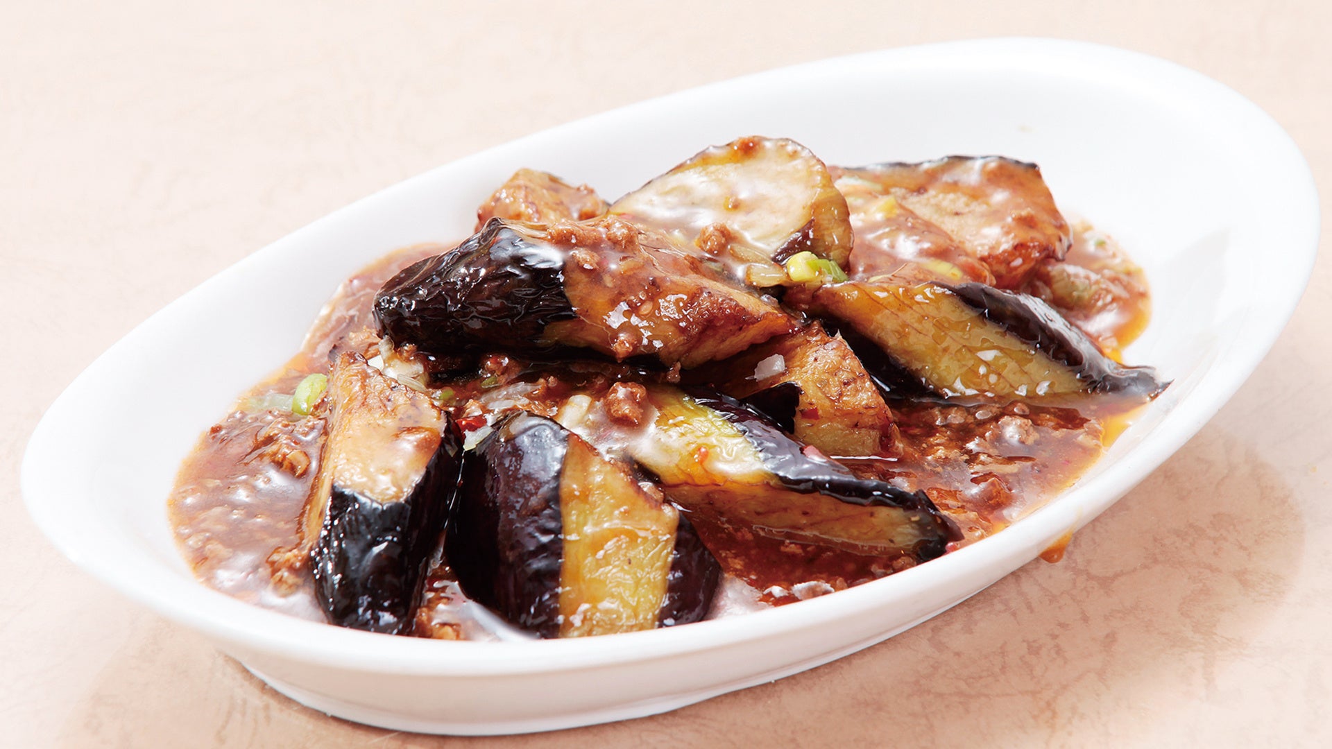 高温で揚げた茄子をニンニク・ショウガ・豆板醬で煮込みまし