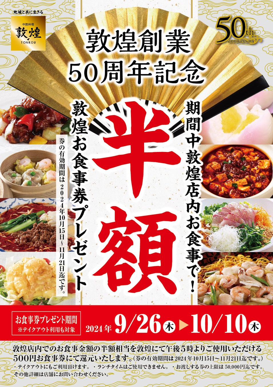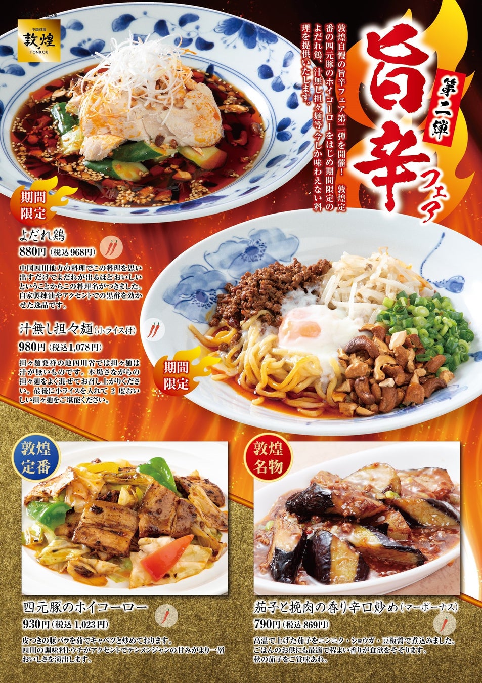 昭和49年の創業以来、四川料理をベースに、地元の皆様の中国料理店として伝統とトレンドが調和する料理を提供してきた「敦煌」。9月20日(金)より山口下関店を除く4店舗にて上品な辛さが料理の風味を引き出す秋の「旨辛フェア」を開催します。名物の茄子と挽肉の香り辛口炒め(マーボーナス)をはじめ、このフェアでしか食べられない「よだれ鶏」、「汁無し担々麺」などをご用意いたしました。また50周年記念としまして全店舗にて9月26日(木)~10月10日(木)のご利用のお客様(テイクアウト利用も含む)へ、ご利用金額の半額分相当の割引券でのキャッシュバックを実施致します。どうぞ、この機会にご利用ください。皆さまのご来店をスタッフ一同お待ちしております。