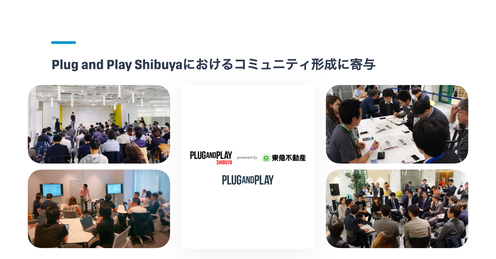 2017年の拠点開設後、東急不動産との共同事業として『Plug and Play Shibuya』に拠点を構え、アクセラレータープログラムを運営するなど数百社の国内外スタートアップを支援し、大手企業とスタートアップを誘引することで、広域渋谷圏における新しい産業創出に取り組んでまいりました。その後、2019年3月の社員数増員に伴いオフィスを隣接するビルである渋谷センタープレイスに移転し、同ビルとPlug and Play Shibuyaにおいて、コミュニティ形成を図ってきました。