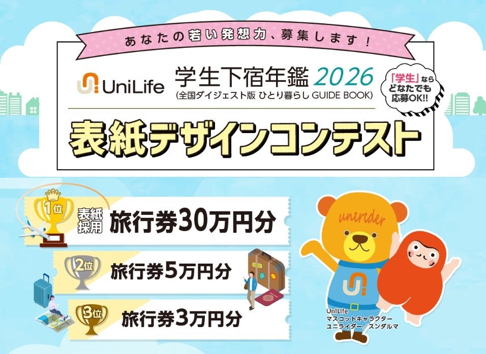 ユニライフの「学生下宿年鑑」シリーズは、受験生・大学生・専門学生向けの『お部屋探し情報誌』です。1985年の初版発行以来、学生の皆様や学校関係者様・家主様に「安全で快適な理想の住まい」をご案内し、今年で創刊40年を迎えます。表紙のデザインを募集する「学生下宿年鑑2026(ひとり暮らしGUIDE BOOK)」は、全国の高校への設置や当社が運営するお部屋紹介店舗で利用されます。