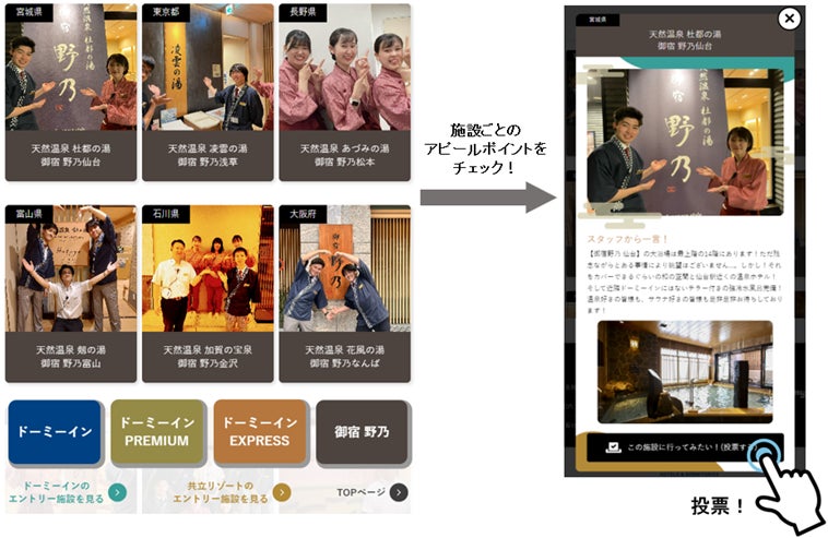特設サイトにアクセスすれば、どなた様でもご投票いただけます。全国の「ドーミーイン」や「共立リゾート」に行ったことがある方もない方も、「行ってみたい!行ってよかった!」と思う施設に、ぜひ清き一票をお願いいたします。