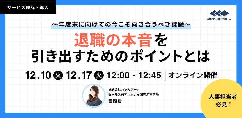 株式会社ハッカズーク(本社:東京都文京区、代表取締役グループCEO:鈴木仁志)は、12/10・17(火)12時00分より、退職者の本音を引き出すポイントについて解説する無料オンラインセミナーを実施することをお知らせいたします。