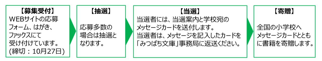 第25回目を迎える本年も、寄贈小学校を全国より募集し、抽選により寄贈先として選ばれた小学校へは、応募者の直筆メッセージカードを添えて、書籍(1セット8冊予定)を寄贈いたします。