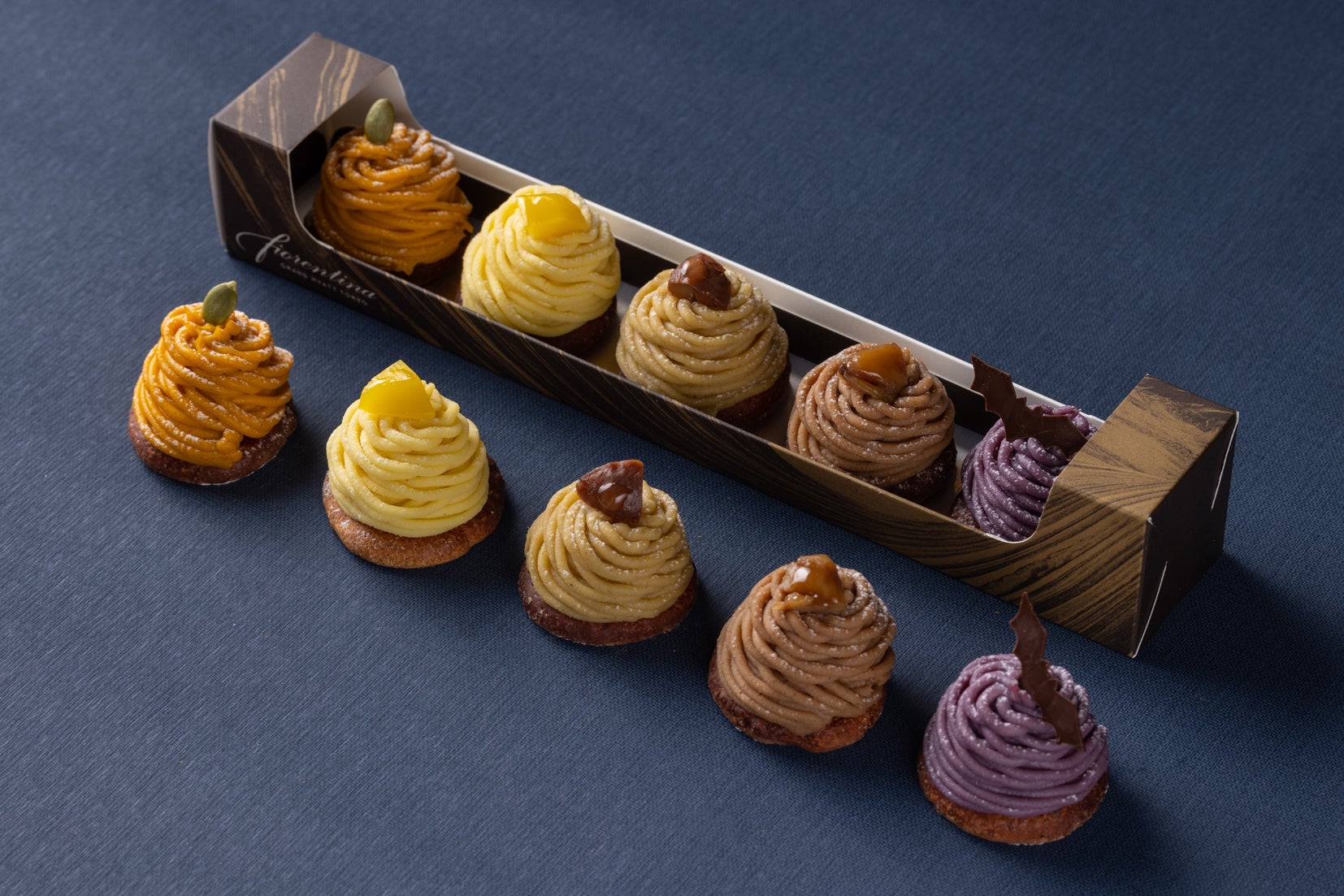 紫芋でつくる新作の“ヴィオーラ”、国産の生栗を煮てつくるこだわりのマロンクリームが特徴の“フレスコ”、栗本来の甘さと風味が味わえるフランス産の栗のペーストで仕上げる“フランシア”、熊本県産の栗を渋皮ごとつかった濃厚なマロンクリームを贅沢につかった“ジャポネーゼ”、そして素材の味を活かした優しい甘さの“パンプキン”の5種類を一口サイズにした、モンブランの食べ比べができる嬉しいセットです。