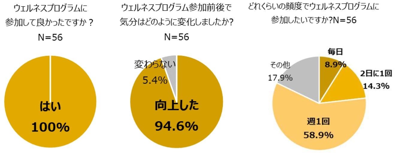参加者同士がコミュニケーションを取る様子が見受けられ、参加後は「短時間でも効果が感じられる内容で、身体がほぐれストレス解消になった」といった声をいただきました。