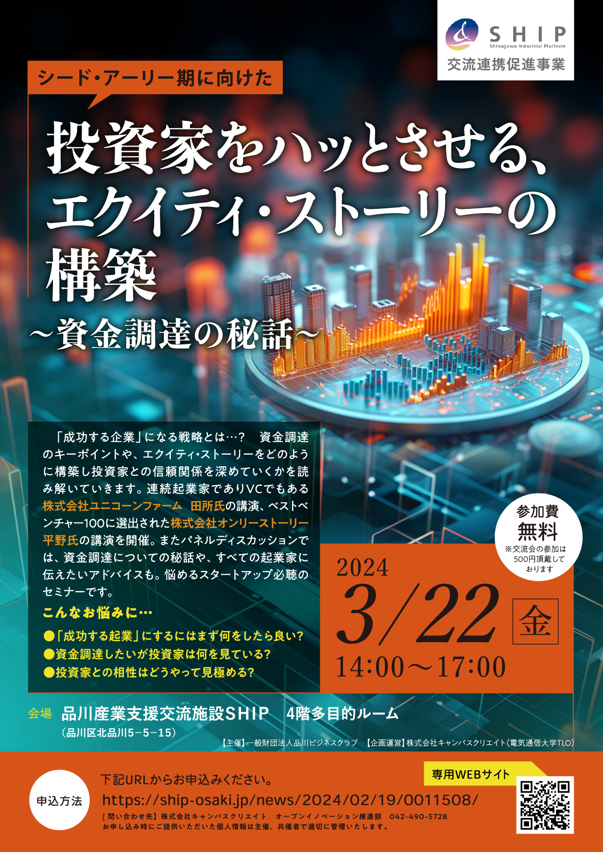 「2024年3月22日(金)14:00~17:00」、品川産業交流支援施設SHIPにて、「投資家をハッとさせる、エクイティ・ストーリーの構築~資金調達の秘話~」を開催します。ぜひご参加くださいませ。