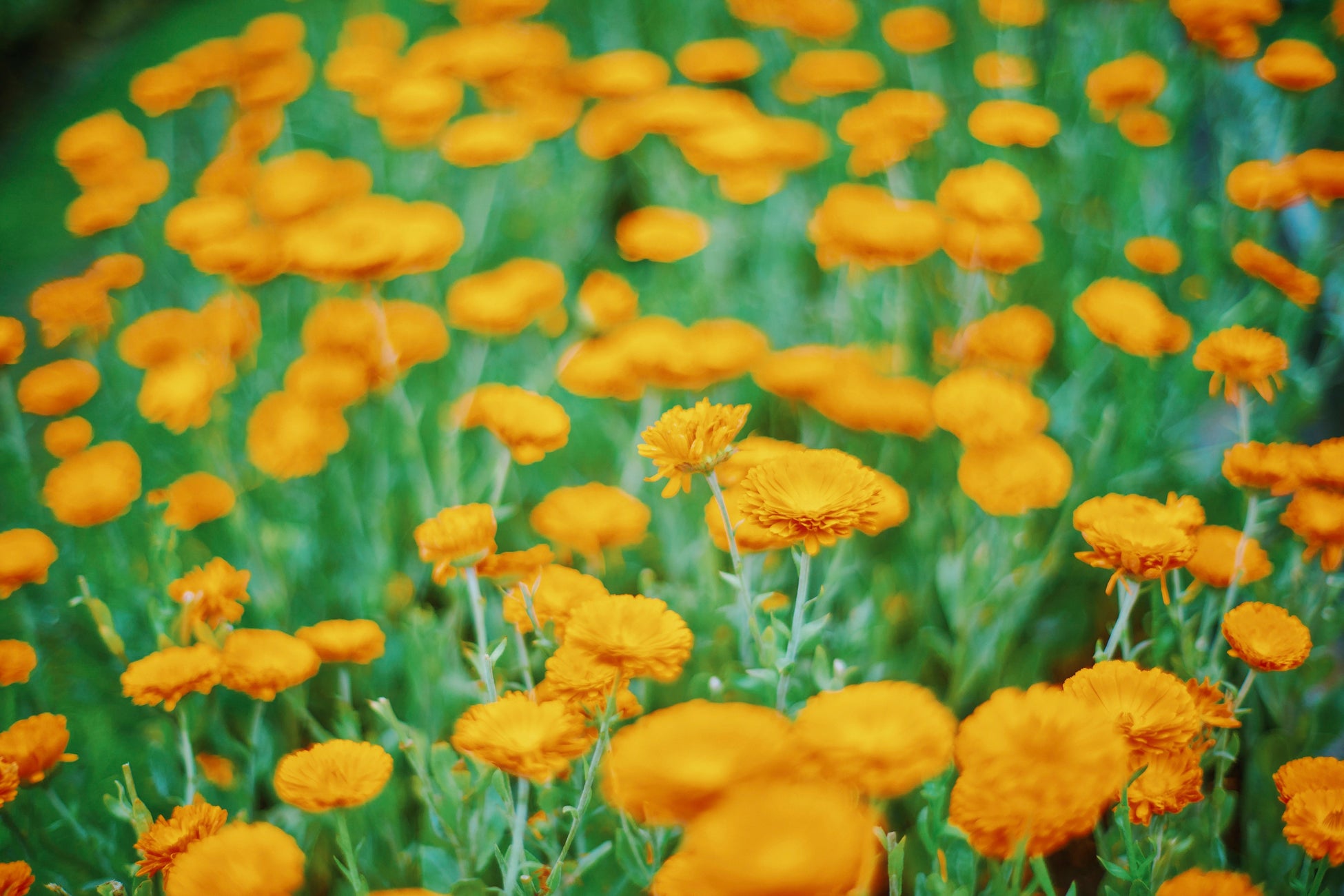 「風の丘フラワー園」カモミールとポットマリーゴールド一面の花畑