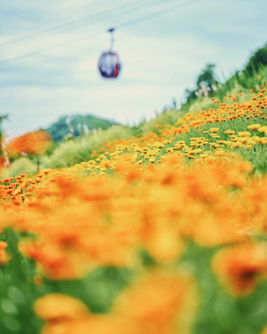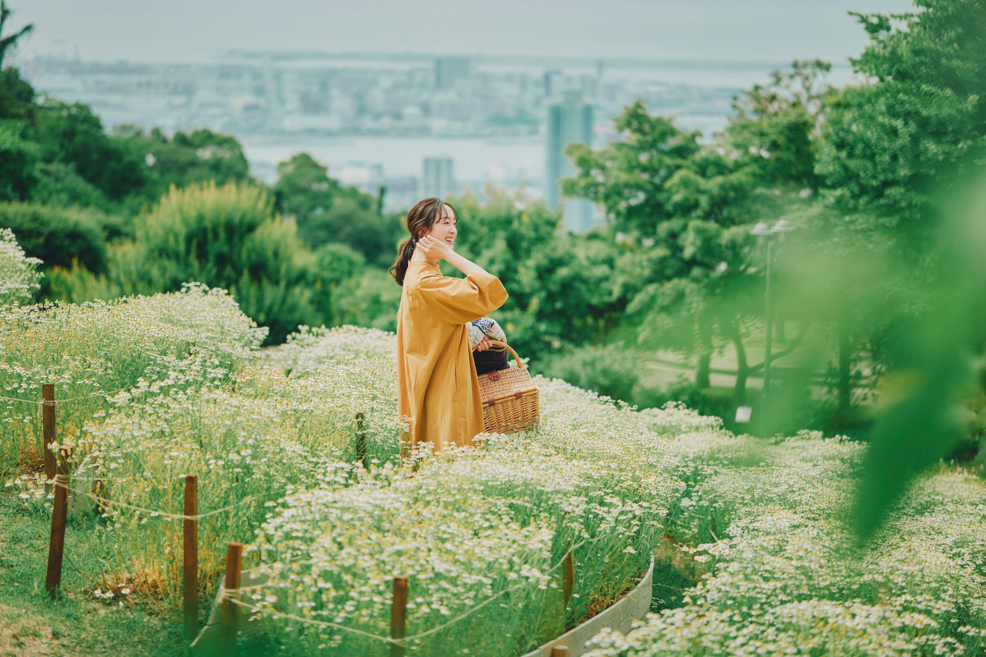 眼下には神戸の街並み。風の丘フラワー園一面を埋め尽くす、カモミールとポットマリーゴールド畑。青空の下で太陽の光を浴びた花々たちが、夕暮れ時には、夕陽を浴びた幻想的な花畑に変貌。昼、夕とフォトスポットとして賑わいます
