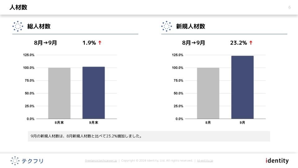 ITフリーランスエンジニアの案件・求人サイト「テクフリ」(https://freelance.techcareer.jp/)を運営する株式会社アイデンティティー(東京都新宿区、代表取締役:今野 力、以下「当社」)は、テクフリのデータベースをもとに2025年9月における人材の市況感を調査しました。より詳しい結果については、お問い合わせから資料請求が可能です。