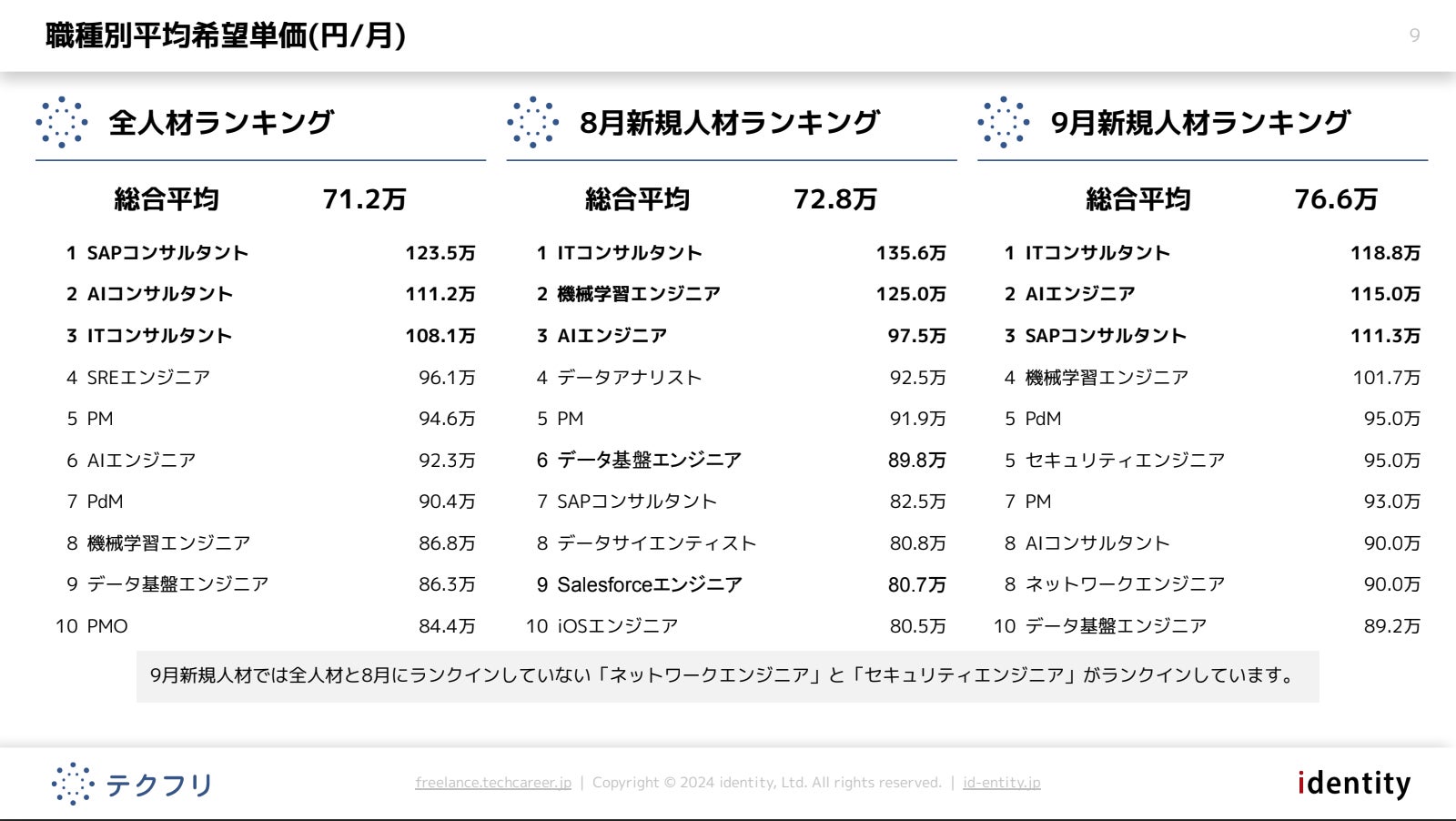 9月新規人材では全人材と8月にランクインしていない「ネットワークエンジニア」と「セキュリティエンジニア」がランクインしています。