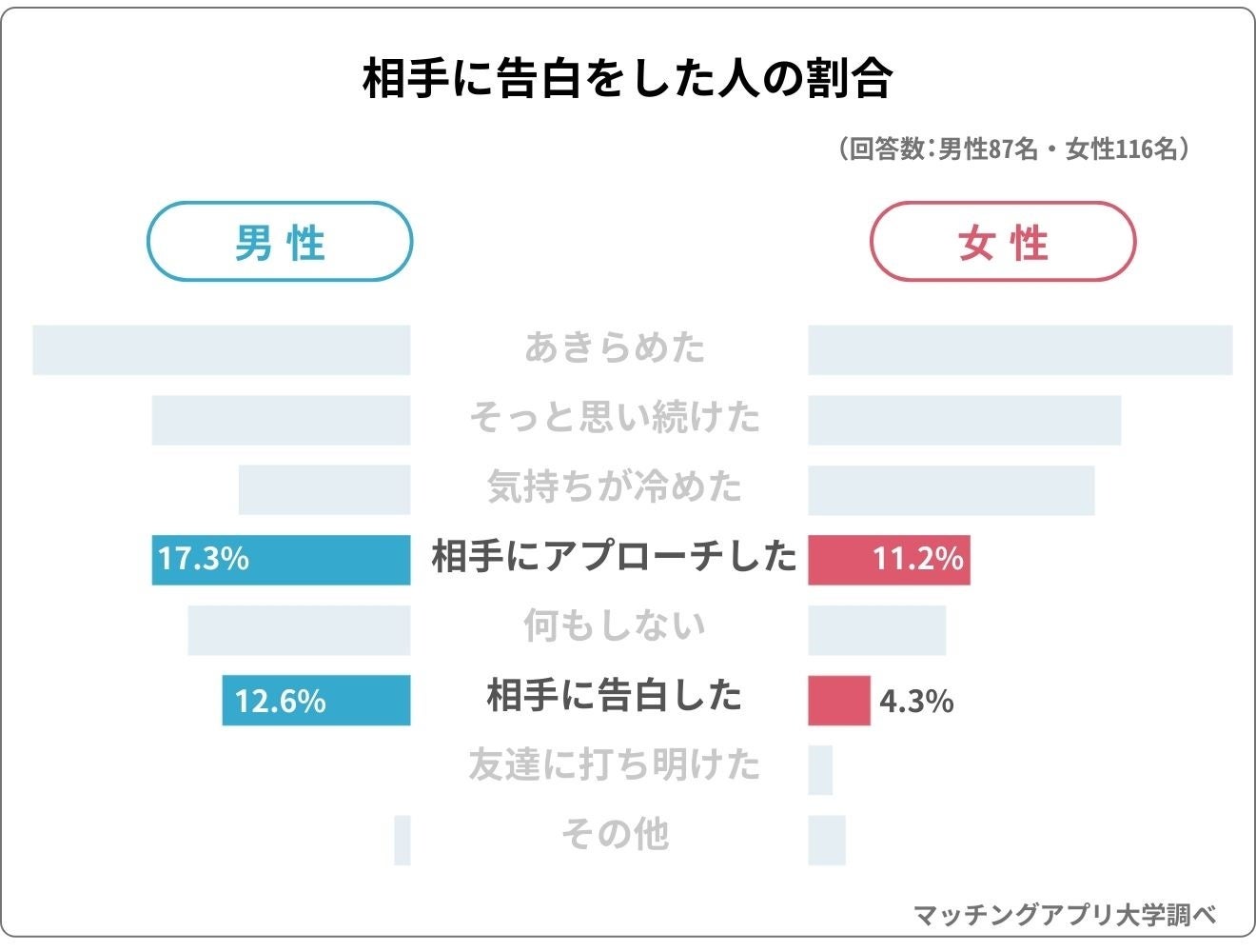 注目すべきは「相手に告白をした」人の割合。女性は4.3%に対し、男性は約3倍の12.6%が「相手に告白をした」と回答しました。「告白まではしないものの相手にアプローチをした」と答えた人も男性が17.3%・女性は11.2%とこちらも男性のほうが多い結果となりました。