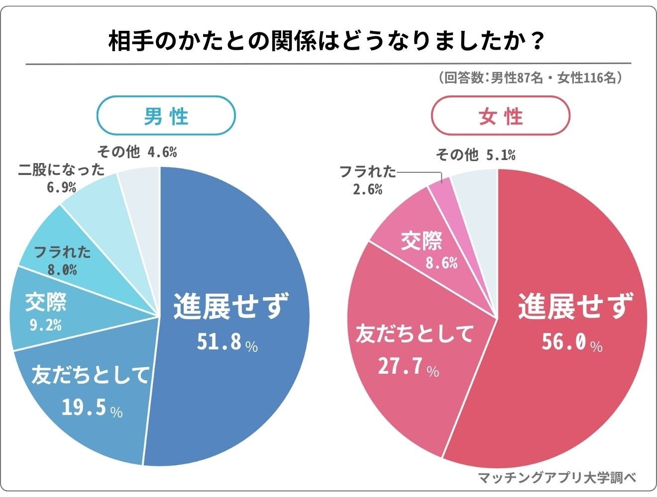 男性が26.9%、女性は38.9%が告白やアプローチの結果「交際した」と答えています。友だちの恋人を奪ってしまうことには賛否両論ありそうですが、告白やアプローチを経て交際に至る人も、実際には少なくはなさそうです。