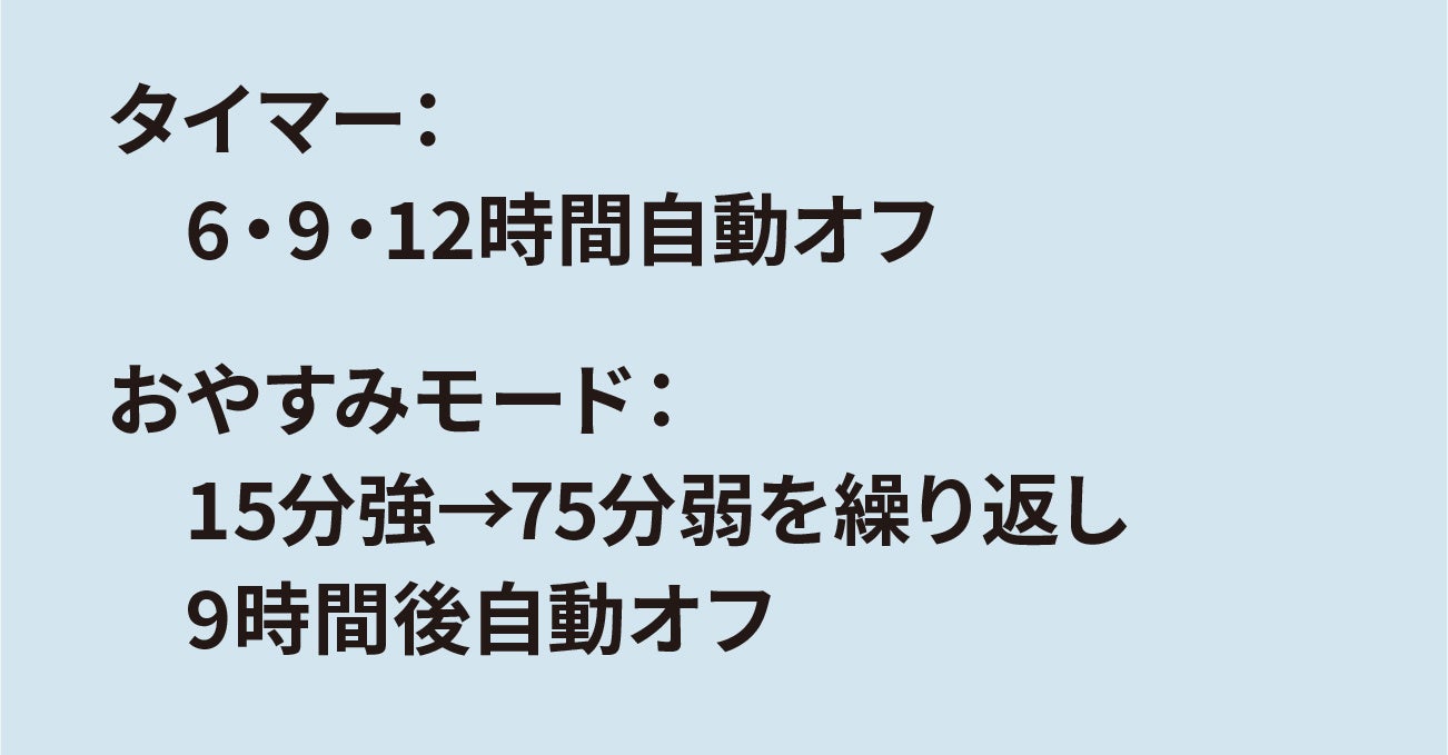 モード :おやすみモード9時間(強15分⇒弱75分の繰り返し)