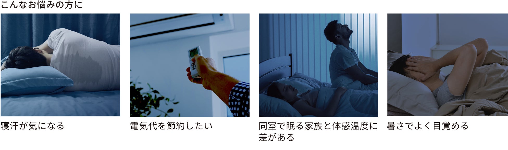 気温や湿度が上がりはじめる梅雨の時期、室温はそれほど高くないのに、敷布団やマットレスが蒸れて不快に感じたことはありませんか?その主な原因は、体温と汗によって寝具内に熱がこもることです。また、熱がこもると寝返りの回数が増えるなど睡眠環境にもよくありません。本製品はマット内を除湿して熱のこもりを低減することでこの問題を解決します。電動ファンでマット内を換気するため、湿度や温度の上昇を持続的に抑えることができます。