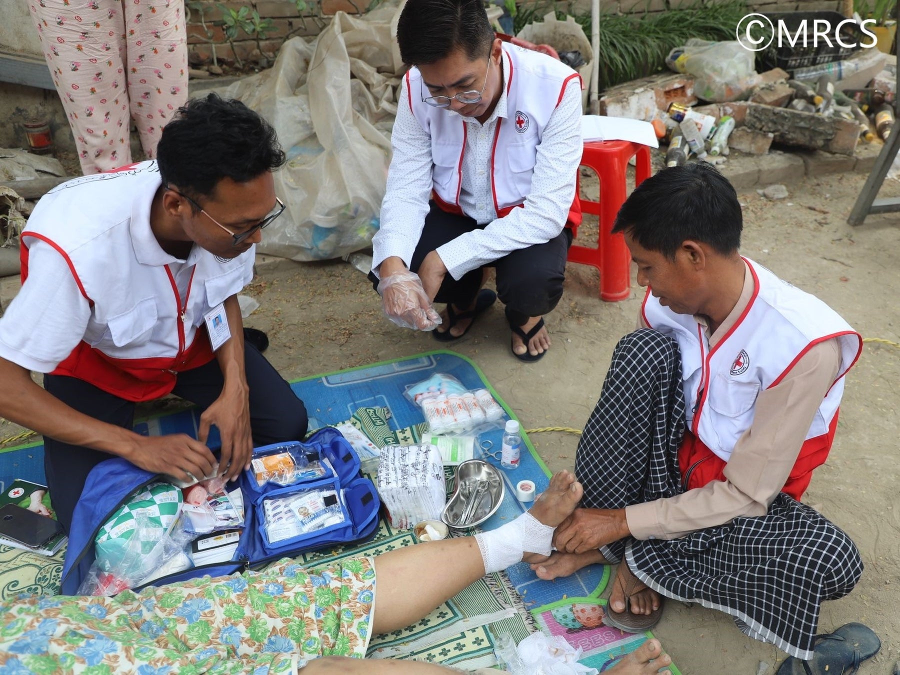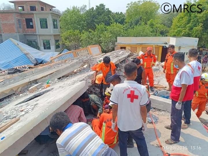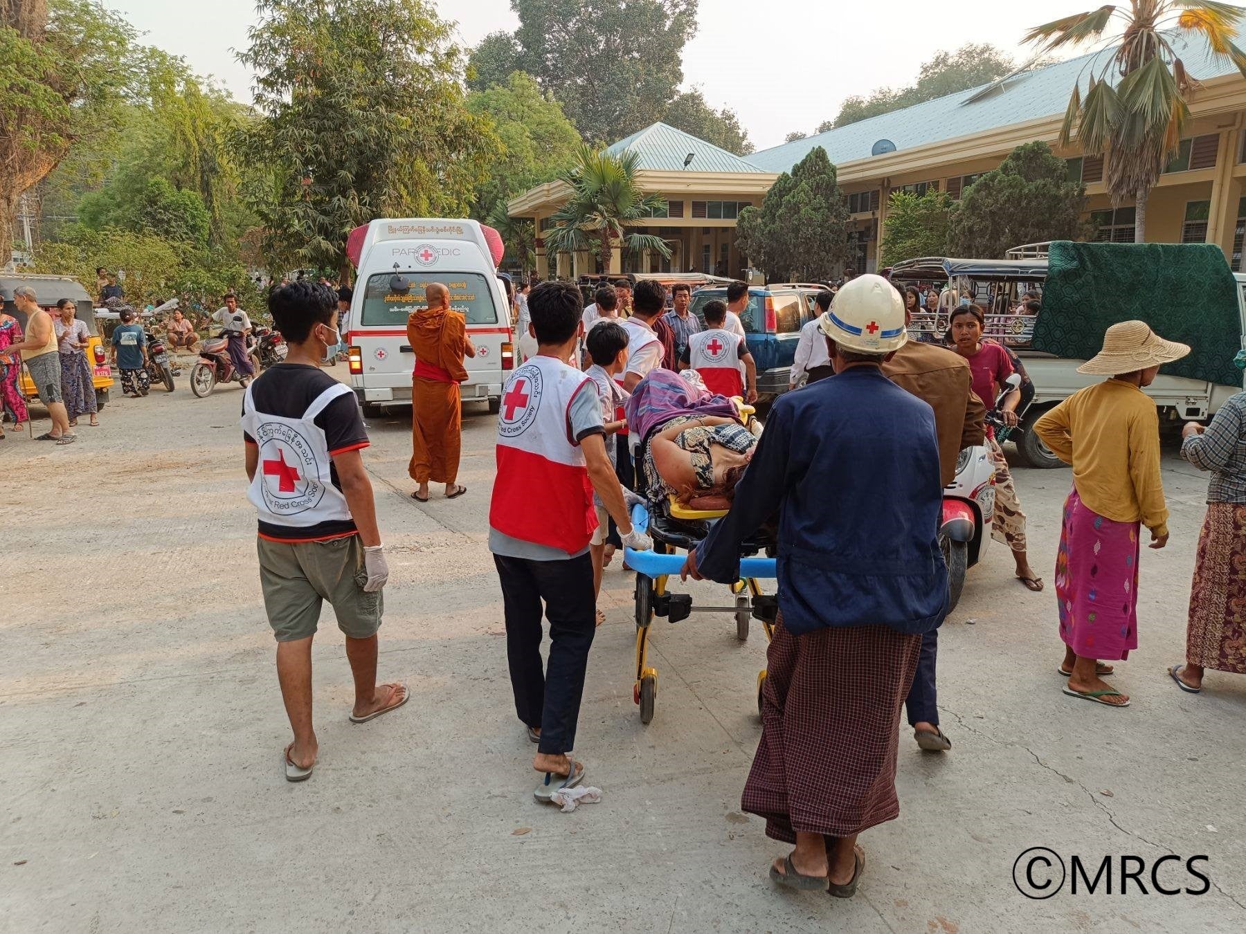 ミャンマー赤十字社は、発災直後から緊急対策本部を設置し、最も被害の大きかった地域に被災地支部の赤十字ボランティアを派遣し、捜索・救助活動や被害状況のアセスメントを開始しました。マンダレーでは、これまで少なくとも負傷者50人の応急手当を行い、重傷者7人をマンダレー病院に搬送しました。