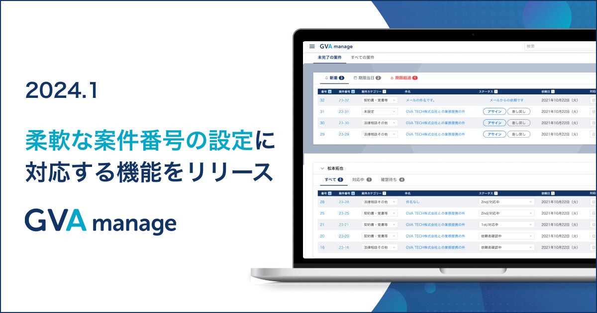 GVA TECH株式会社(本社:東京都渋谷区、代表取締役:山本 俊、以下GVA TECH)は、マターマネジメントシステム「GVA manage(ジーヴァ マネージ)」が、柔軟な案件番号の設定に対応出来るようになったことをお知らせいたします。