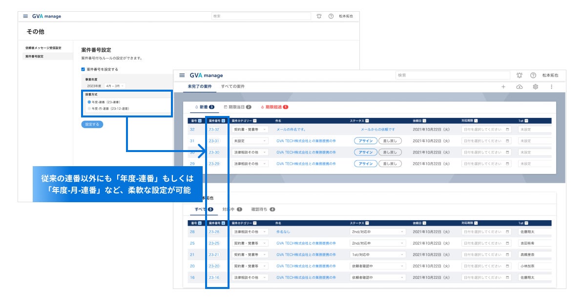 これにより、従来の全案件への連番方法以外にも「年度-連番」もしくは「年度-月-連番」など、柔軟な設定が可能となり、ユーザーはより容易に案件の把握や管理が行うことが可能になります。